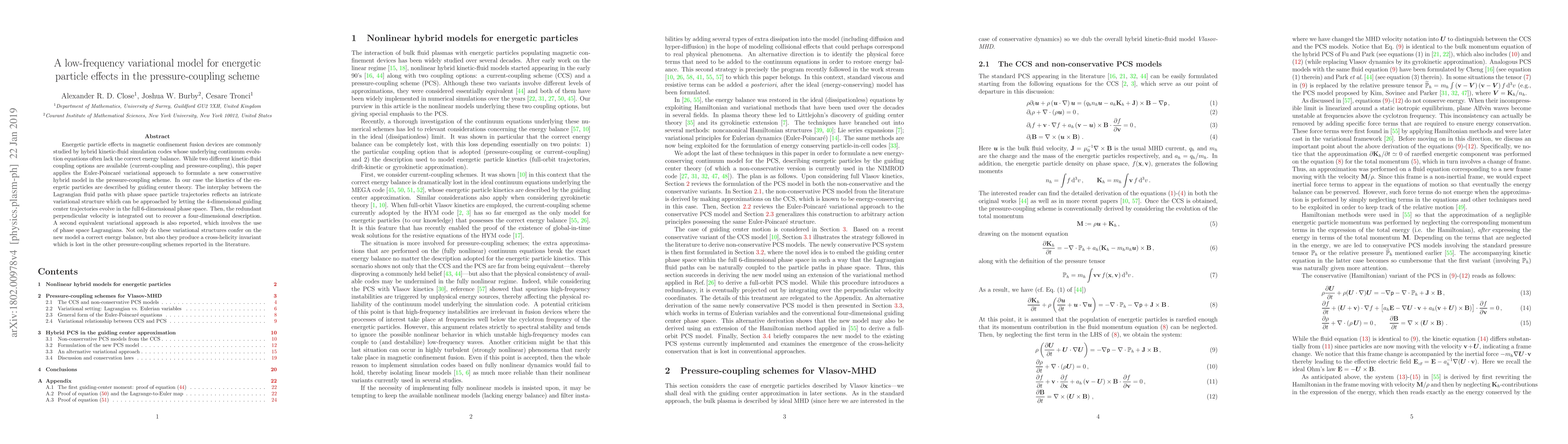 This paper introduces a low-frequency variational model for energetic particle effects in the pressure-coupling scheme, using the Euler-Poincaré variational approach to ensure a correct energy balance and cross-helicity invariance, which is absent in existing models. The model integrates guiding center theory within a hybrid kinetic-fluid framework.