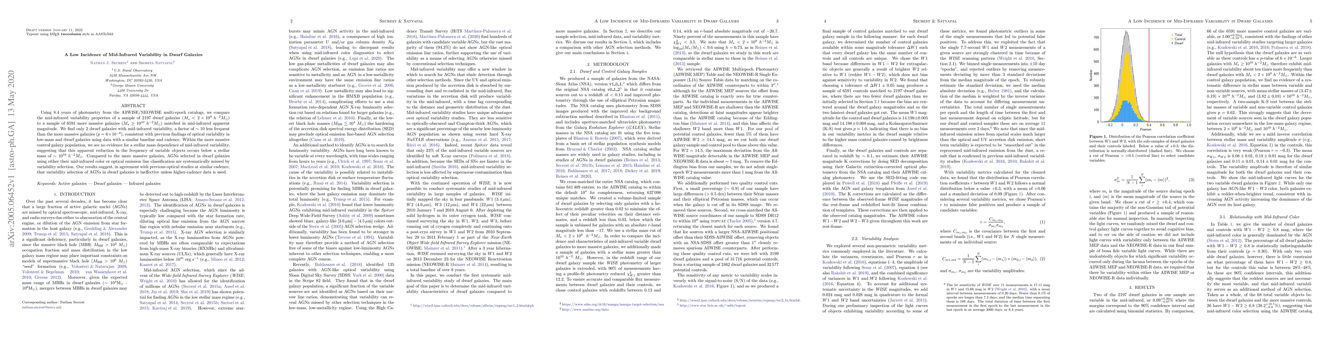 This study finds that dwarf galaxies exhibit significantly lower mid-infrared variability compared to more massive galaxies, with only 2 out of 2197 dwarf galaxies showing variability, suggesting a factor of ~10 less frequent occurrence. This finding supports the ineffectiveness of variability selection for identifying AGNs in dwarf galaxies.