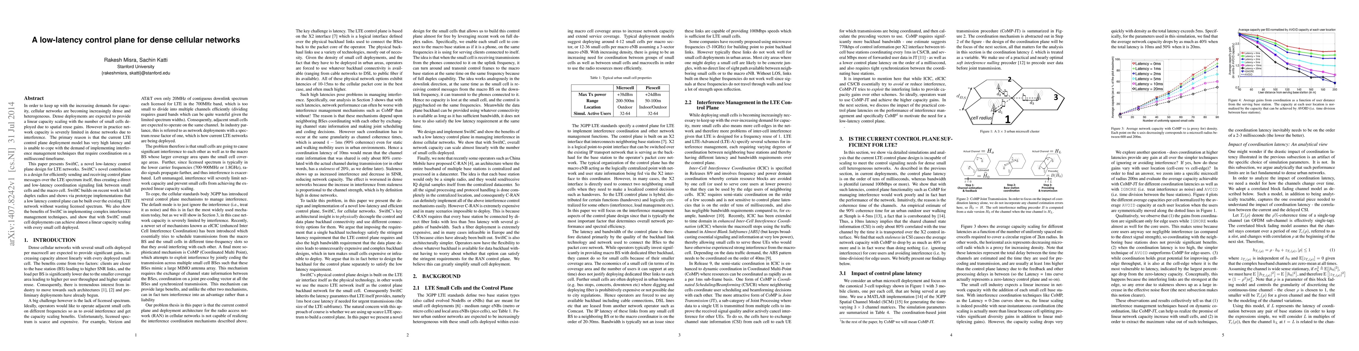 This paper introduces SwiftC, a low-latency control plane design for LTE networks to address interference in dense cellular deployments. SwiftC leverages the LTE spectrum for efficient control plane messaging, enabling millisecond-level coordination and achieving near-linear capacity scaling with small cell additions.
