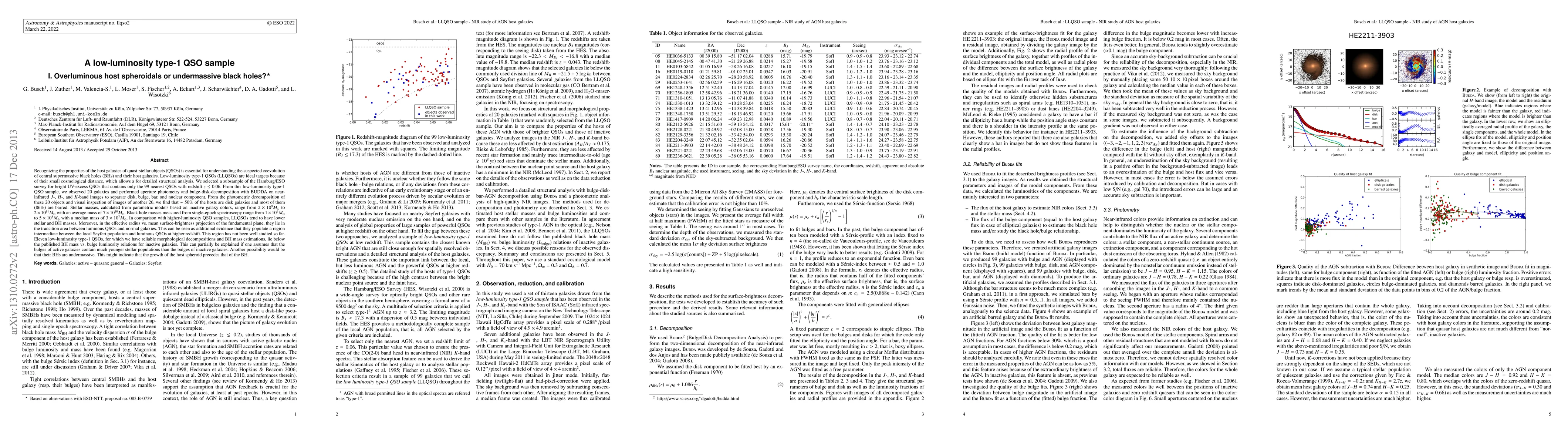 Recognizing the properties of the host galaxies of quasi-stellar objects (QSOs) is essential to understand the suspected coevolution of central supermassive black holes (BHs) and their host galaxies. We selected a subsample of the Hamburg/ESO survey for bright UV-excess QSOs, containing only the 99 nearest QSOs with redshift z<=0.06, that are close enough to allow detailed structural analysis. From this "low-luminosity type-1 QSO sample", we observed 20 galaxies and performed aperture photometry and bulge-disk-bar-AGN-decomposition with BUDDA on near-infrared J, H, K band images. From the photometric decomposition of these 20 objects and visual inspection of images of another 26, we find that ~50% of the hosts are disk galaxies and most of them (86%) are barred. Stellar masses, calculated from parametric models based on inactive galaxy colors, range from 2x10^9 M_sun to 2x10^11 M_sun. Black hole masses measured from single epoch spectroscopy range from 1x10^6 M_sun to 5x10^8 M_sun. In comparison to higher luminosity QSO samples, LLQSOs tend to have lower stellar and BH masses. Also, in the effective radius vs. mean surface-brightness projection of the fundamental plane, they lie in the transition area between luminous QSOs and "normal" galaxies. This can be seen as further evidence that they can be pictured as a "bridge" between the local Seyfert population and luminous QSOs at higher redshift. Eleven low-luminosity QSOs for which we have reliable morphological decompositions and BH mass estimations lie below the published BH mass vs. bulge luminosity relations for inactive galaxies. This could be partially explained by bulges of active galaxies containing much younger stellar populations than bulges of inactive galaxies. Also, one could suspect that their BHs are undermassive. This might hint at the growth of the host spheroid to precede that of the BH.