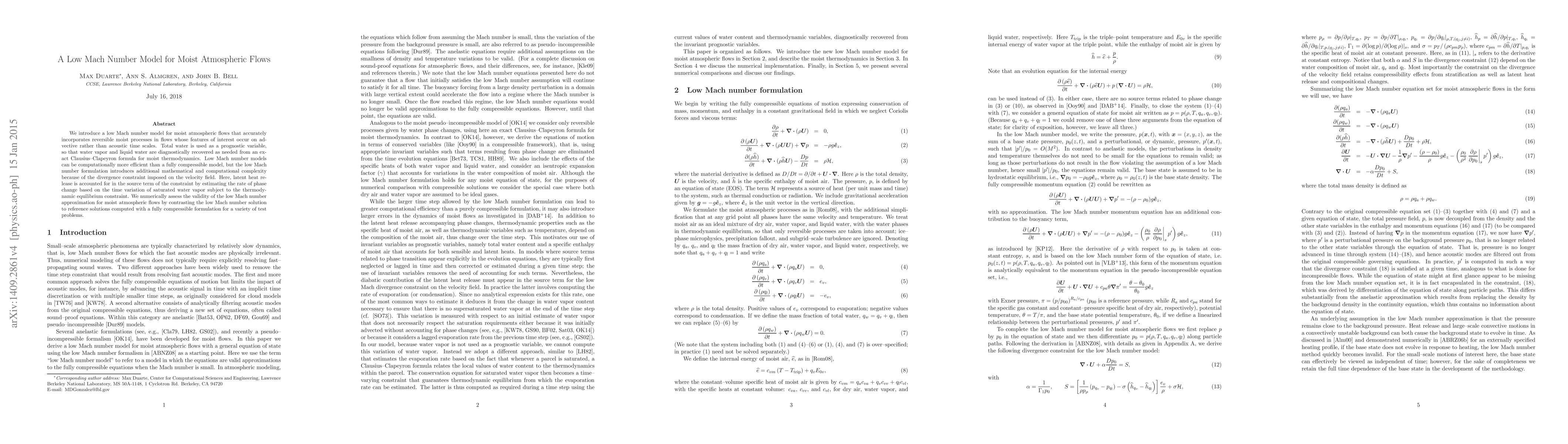 This paper introduces a low Mach number model for moist atmospheric flows, focusing on reversible moist processes occurring on advective time scales. The model uses total water as a prognostic variable, efficiently accounting for latent heat release through a thermodynamic equilibrium constraint, and is shown to be computationally more efficient than fully compressible models.