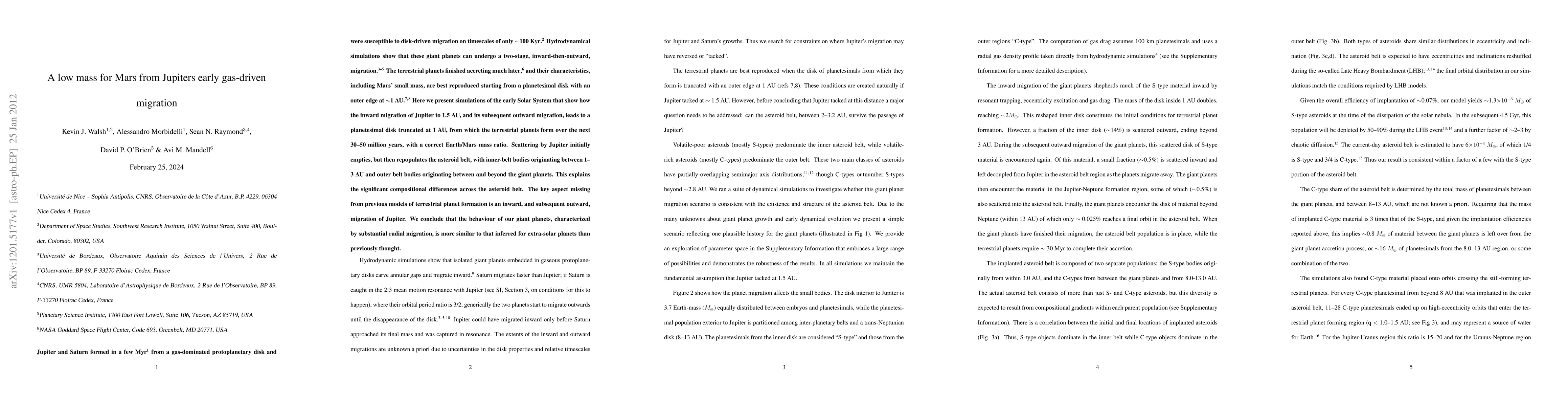 This research demonstrates that Jupiter's early gas-driven migration to 1.5 AU and subsequent outward migration truncates the planetesimal disk at 1 AU, leading to the formation of terrestrial planets with an Earth/Mars mass ratio consistent with observations. This migration explains Mars' low mass and compositional differences in the asteroid belt.