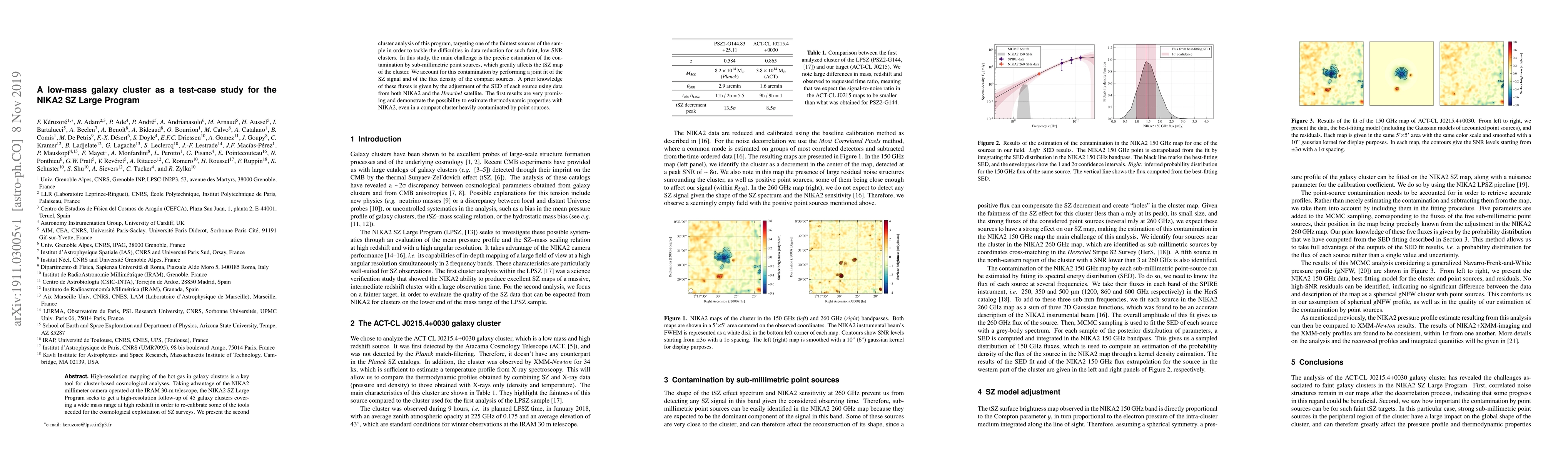 High-resolution mapping of the hot gas in galaxy clusters is a key tool for cluster-based cosmological analyses. Taking advantage of the NIKA2 millimeter camera operated at the IRAM 30-m telescope, the NIKA2 SZ Large Program seeks to get a high-resolution follow-up of 45 galaxy clusters covering a wide mass range at high redshift in order to re-calibrate some of the tools needed for the cosmological exploitation of SZ surveys. We present the second cluster analysis of this program, targeting one of the faintest sources of the sample in order to tackle the difficulties in data reduction for such faint, low-SNR clusters. In this study, the main challenge is the precise estimation of the contamination by sub-millimetric point sources, which greatly affects the tSZ map of the cluster. We account for this contamination by performing a joint fit of the SZ signal and of the flux density of the compact sources. A prior knowledge of these fluxes is given by the adjustment of the SED of each source using data from both NIKA2 and the \textit{Herschel} satellite. The first results are very promising and demonstrate the possibility to estimate thermodynamic properties with NIKA2, even in a compact cluster heavily contaminated by point sources.
