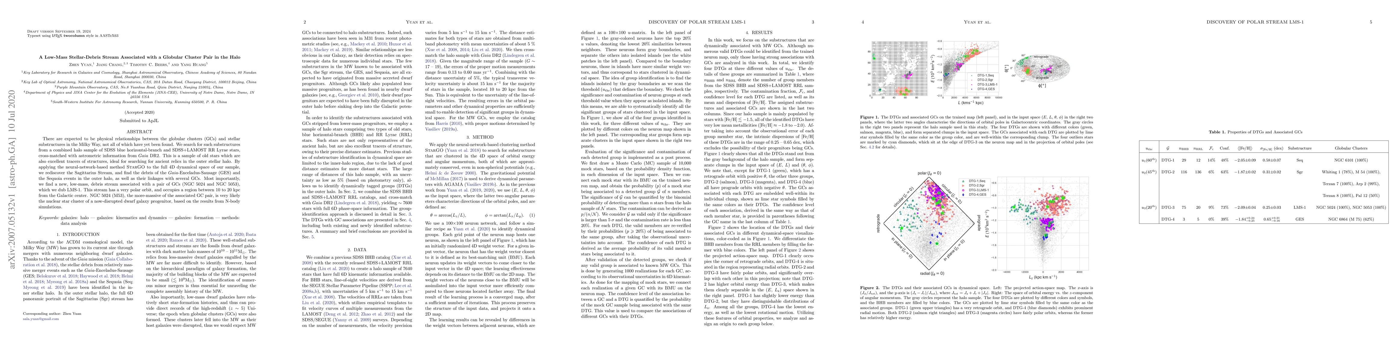 This paper identifies a new low-mass stellar-debris stream, LMS-1, associated with a globular cluster pair (NGC 5024 and NGC 5053) in the Milky Way's halo, using a neural-network-based method. The stream likely originates from the disrupted remnants of a dwarf galaxy progenitor.