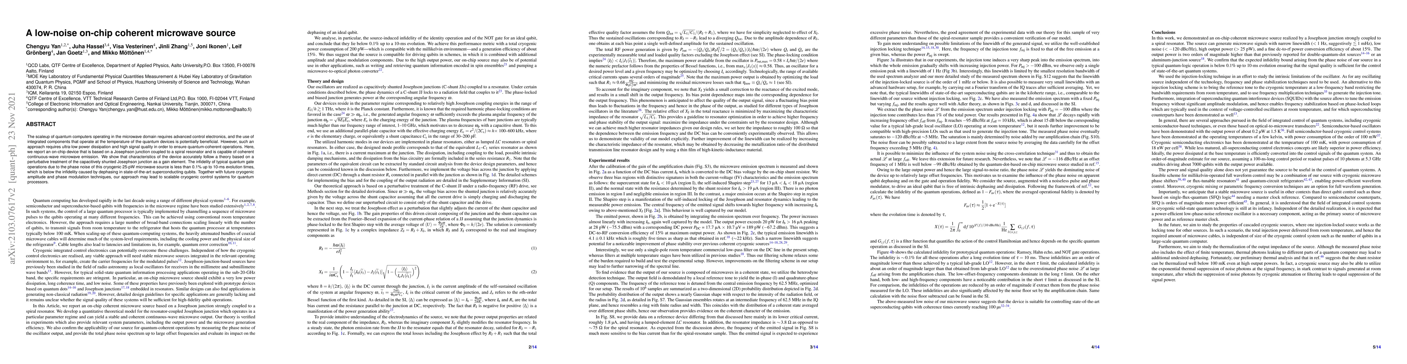 This paper presents an on-chip coherent microwave source based on a Josephson junction coupled to a spiral resonator, achieving low-noise, continuous-wave microwave emission at cryogenic temperatures. The device exhibits high signal quality and low power dissipation, enabling quantum-coherent operations with an infidelity below 0.1% for quantum gate operations.