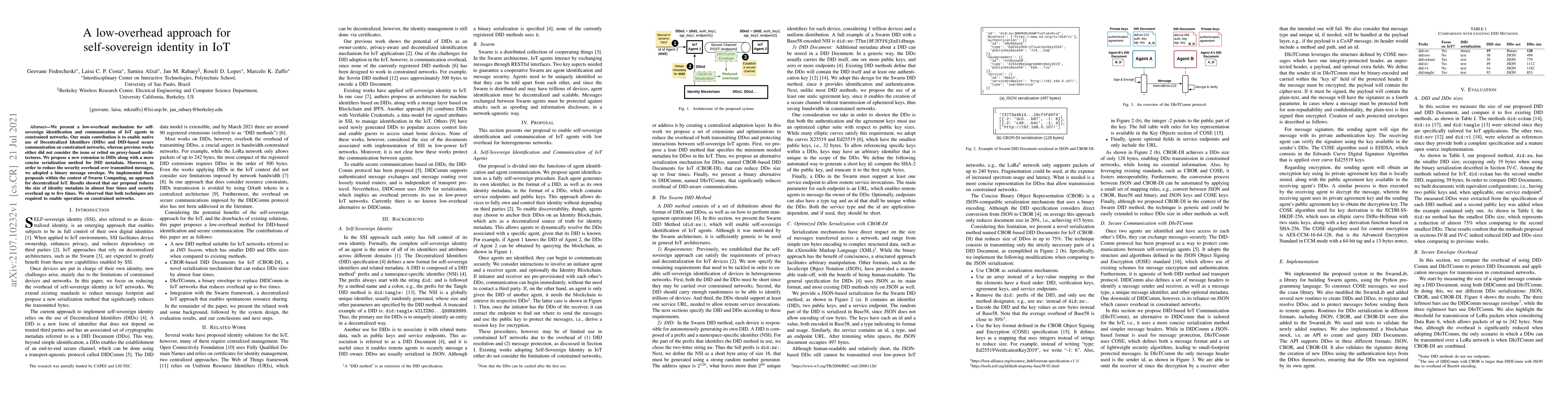 This paper proposes a low-overhead mechanism for self-sovereign identification of IoT agents using Decentralized Identifiers (DIDs) in constrained networks. The authors introduce a new DID extension and a concise serialization method, along with a binary message envelope, achieving significant reductions in metadata size and security overhead.