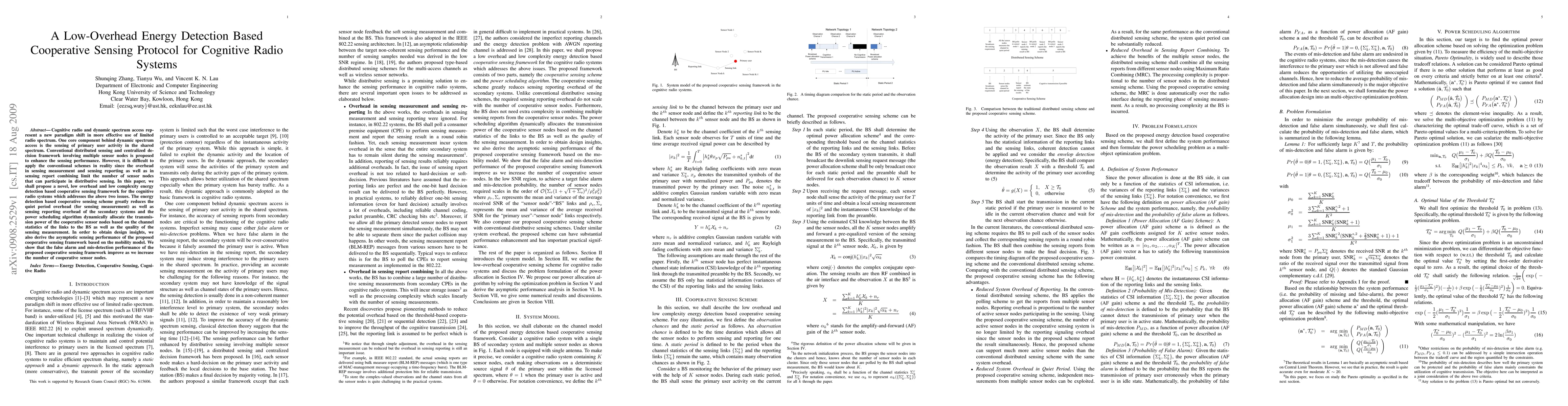 This paper proposes a low-overhead energy detection based cooperative sensing protocol to enhance dynamic spectrum access in cognitive radio systems, addressing measurement and reporting overhead. The protocol improves false alarm and mis-detection performance by dynamically allocating the transmission power of sensor nodes based on channel statistics and sensing quality.