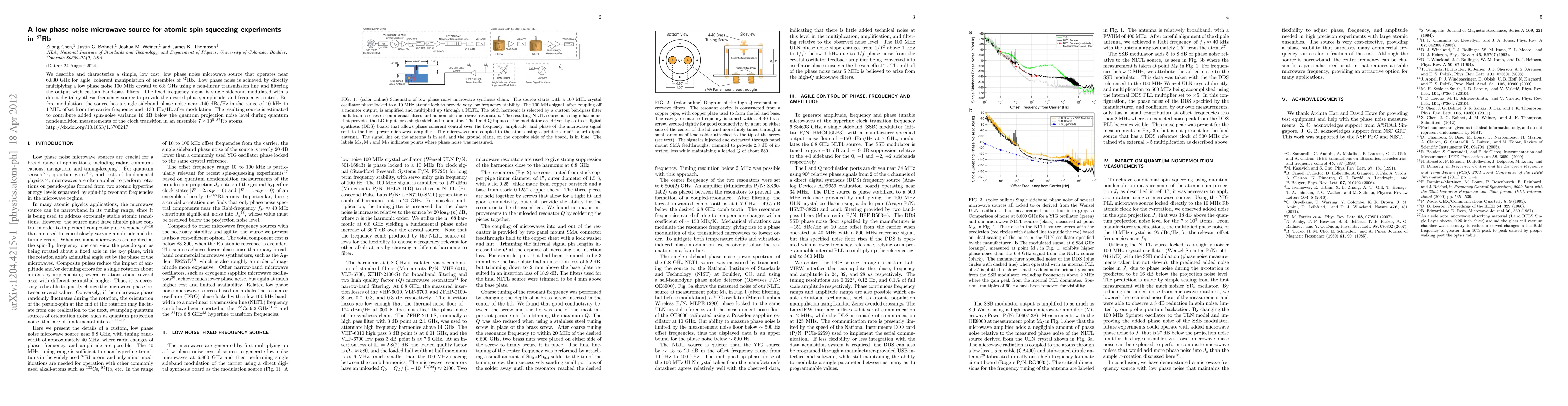 This paper presents a low-cost, low phase noise microwave source operating at 6.800 GHz for atomic spin squeezing experiments in 87Rb, achieved by multiplying a 100 MHz crystal and filtering with custom band-pass filters. The source provides phase, amplitude, and frequency control, contributing minimal spin-noise variance to quantum measurements.