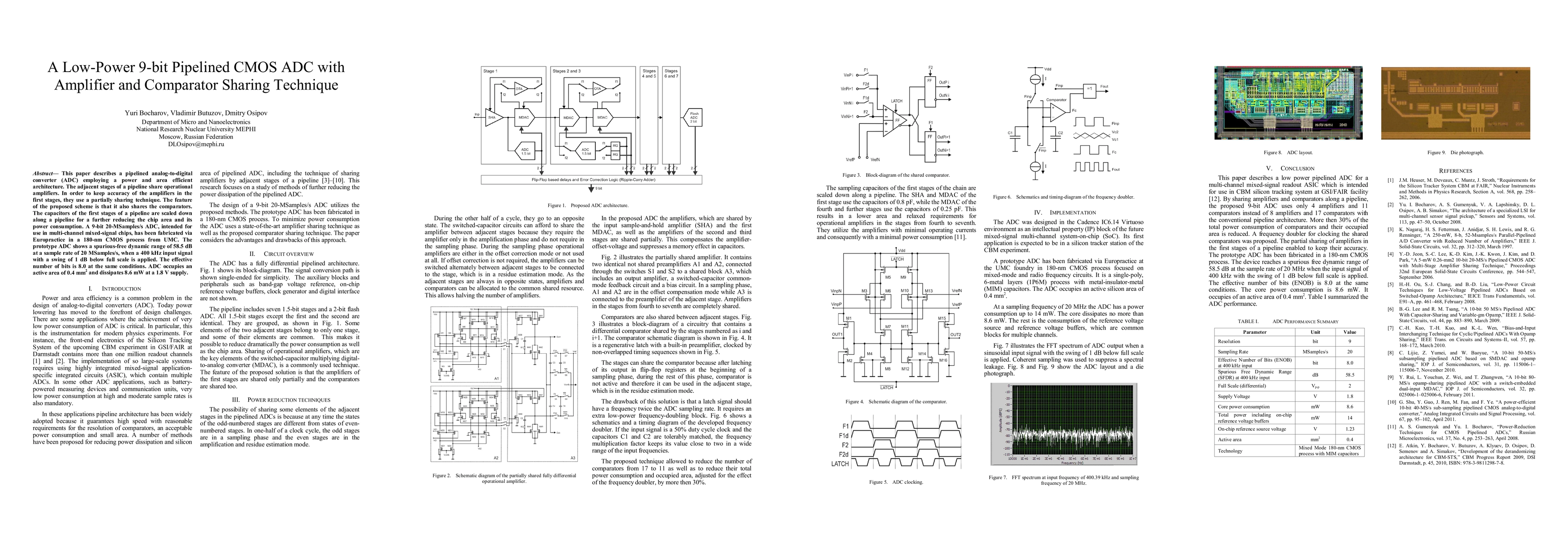 A low-power 9-bit pipelined ADC shares operational amplifiers and comparators across stages to reduce power consumption, achieving a spurious-free dynamic range of 58.5 dB at 20 MSamples/s.