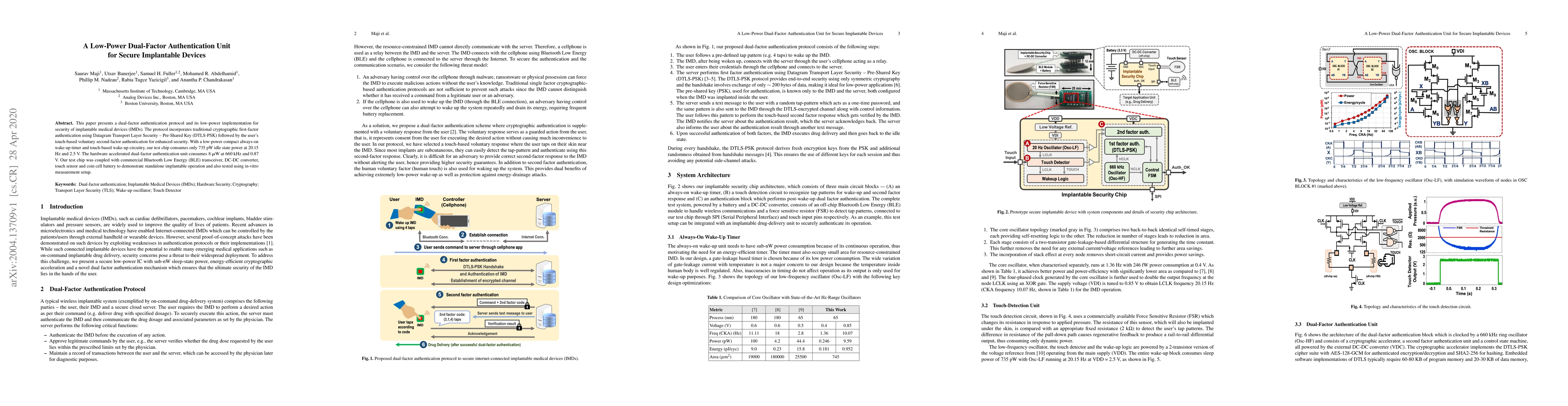 This paper introduces a low-power dual-factor authentication unit for secure implantable medical devices, combining DTLS-PSK for cryptographic authentication and touch-based voluntary second-factor verification. The implementation achieves minimal power consumption, demonstrating 735 pW in idle state and 8 µW during operation.