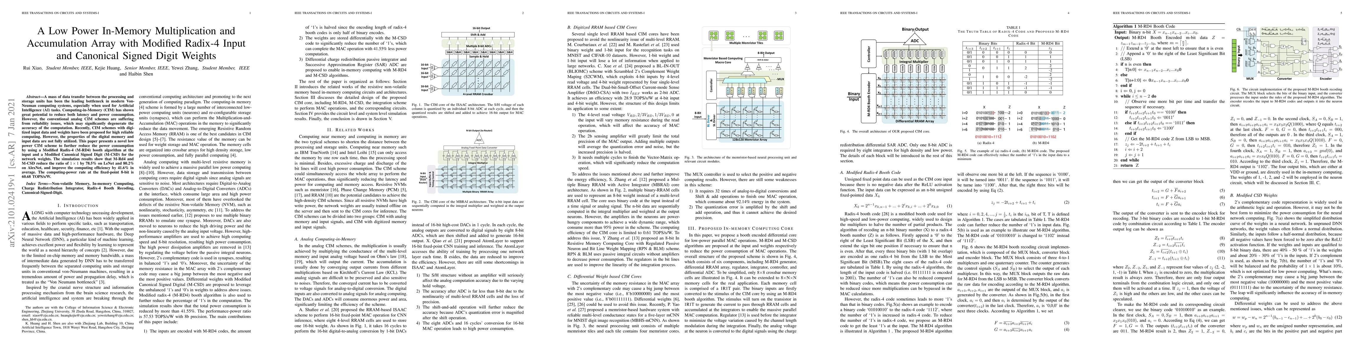 A mass of data transfer between the processing and storage units has been the leading bottleneck in modern Von-Neuman computing systems, especially when used for Artificial Intelligence (AI) tasks. Computing-in-Memory (CIM) has shown great potential to reduce both latency and power consumption. However, the conventional analog CIM schemes are suffering from reliability issues, which may significantly degenerate the accuracy of the computation. Recently, CIM schemes with digitized input data and weights have been proposed for high reliable computing. However, the properties of the digital memory and input data are not fully utilized. This paper presents a novel low power CIM scheme to further reduce the power consumption by using a Modified Radix-4 (M-RD4) booth algorithm at the input and a Modified Canonical Signed Digit (M-CSD) for the network weights. The simulation results show that M-Rd4 and M-CSD reduce the ratio of $1\times1$ by 78.5\% on LeNet and 80.2\% on AlexNet, and improve the computing efficiency by 41.6\% in average. The computing-power rate at the fixed-point 8-bit is 60.68 TOPS/s/W.