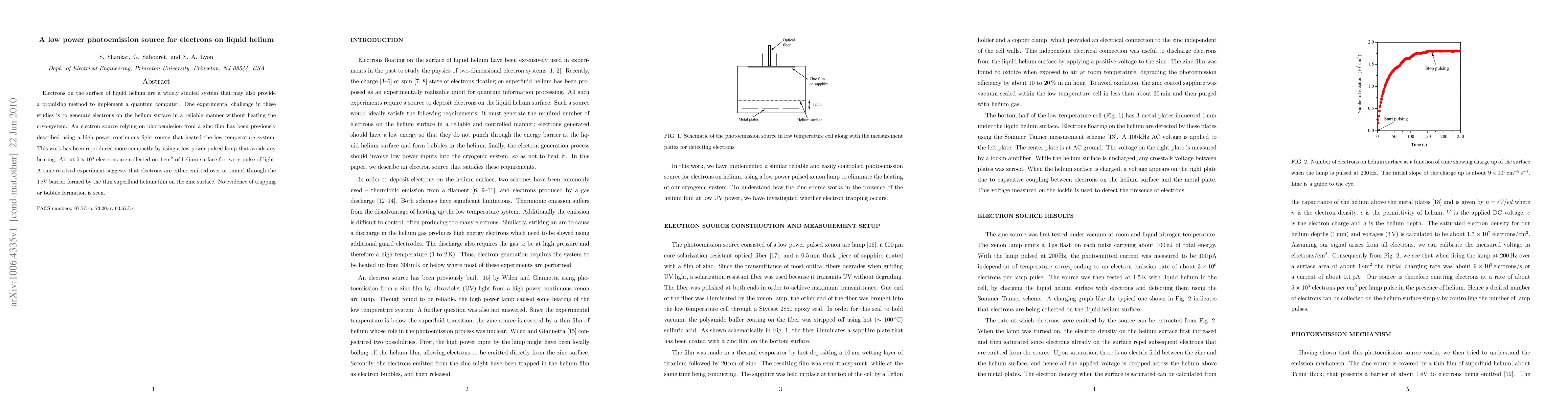 This paper presents a low power, pulsed photoemission source for generating electrons on liquid helium without heating the system, using a zinc film. The method collects about 5,000 electrons per pulse on a 1 cm^2 surface, with no evidence of trapping or bubble formation, suggesting electron emission or tunneling through a 1 eV barrier.
