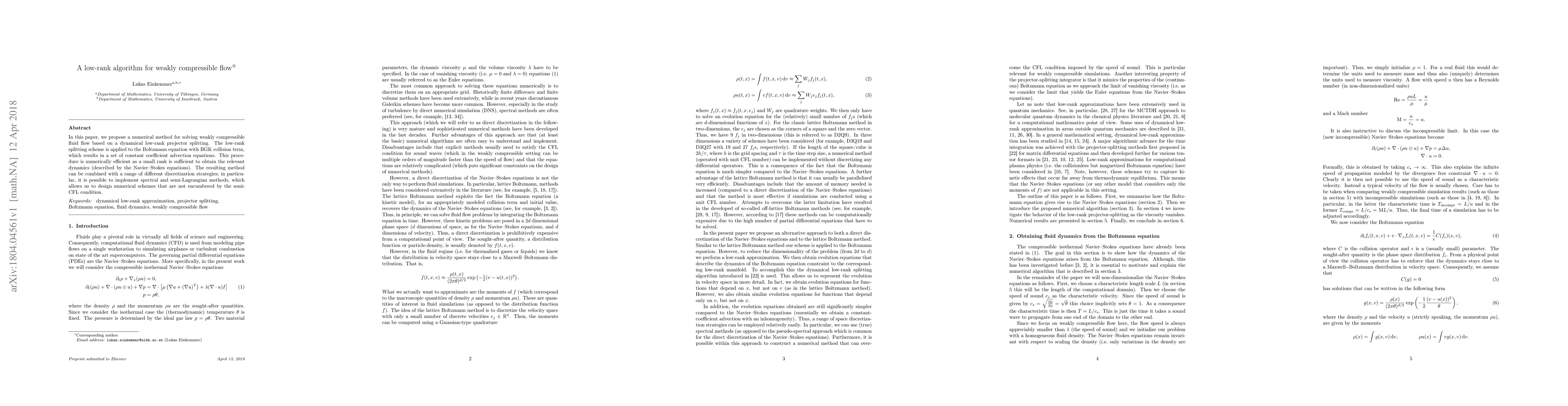 This paper introduces a low-rank numerical method for solving weakly compressible fluid flow based on dynamical low-rank projector splitting applied to the Boltzmann equation, resulting in efficient constant coefficient advection equations. The method is versatile and can be combined with spectral and semi-Lagrangian methods, avoiding the sonic CFL condition.