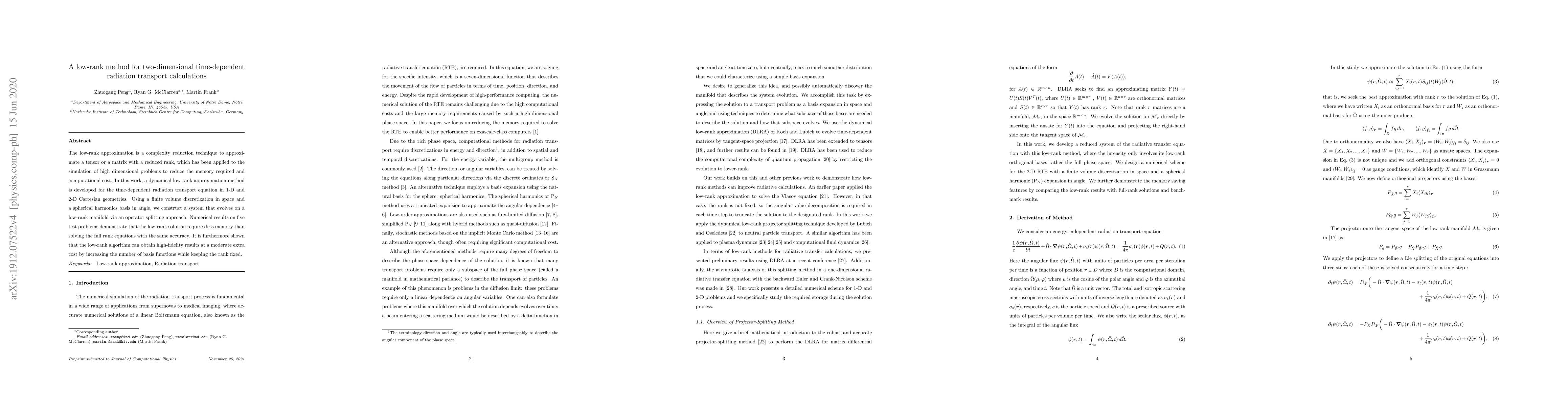 This paper develops a low-rank approximation method to efficiently solve the time-dependent radiation transport equation in 1-D and 2-D geometries, demonstrating reduced memory usage and computational cost compared to full rank solutions. The method employs operator splitting and achieves high-fidelity results by adjusting basis functions.