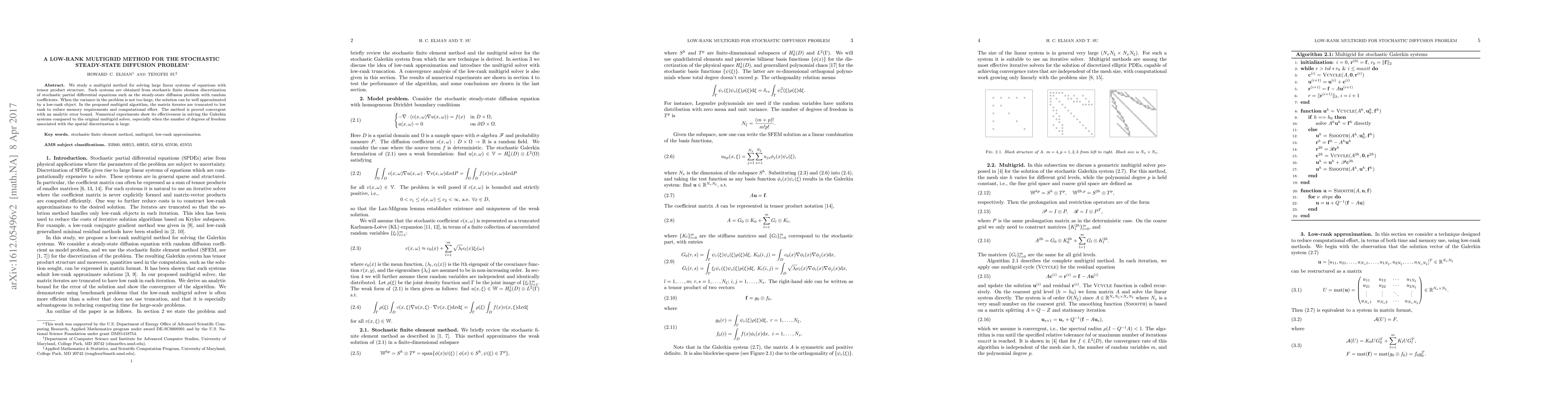 This paper proposes a low-rank multigrid method to efficiently solve large linear systems arising from stochastic finite element discretizations of steady-state diffusion problems. The method truncates matrix iterates to low rank, reducing memory and computational effort, and is shown to be convergent with an analytic error bound, outperforming traditional multigrid solvers in numerical experiments.