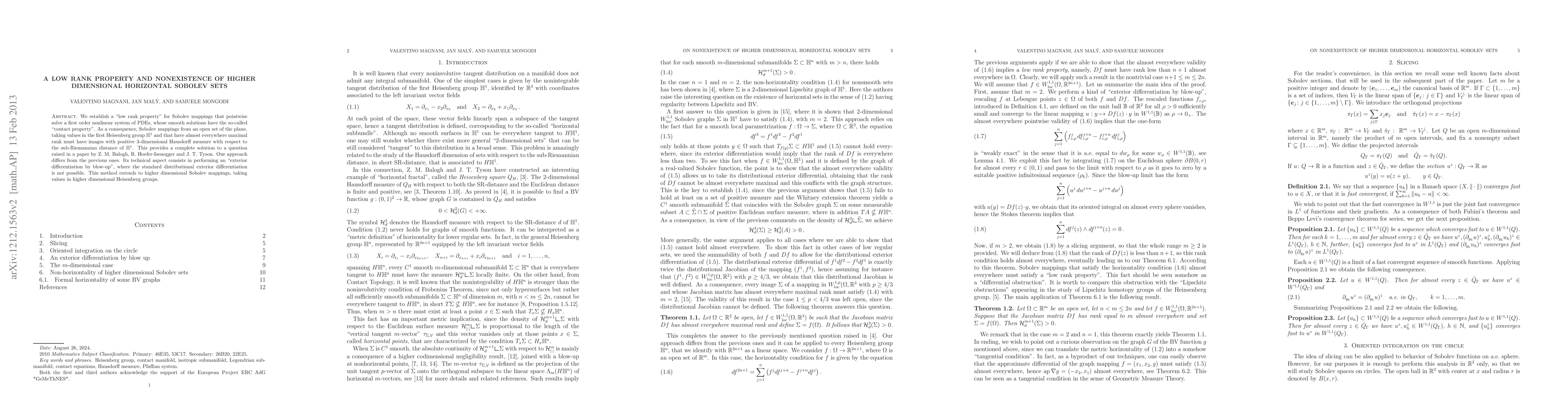 We establish a "low rank property" for Sobolev mappings that pointwise solve a first order nonlinear system of PDEs, whose smooth solutions have the so-called "contact property". As a consequence, Sobolev mappings from an open set of the plane, taking values in the first Heisenberg group and that have almost everywhere maximal rank must have images with positive 3-dimensional Hausdorff measure with respect to the sub-Riemannian distance of the Heisenberg group. This provides a complete solution to a question raised in a paper by Z. M. Balogh, R. Hoefer-Isenegger and J. T. Tyson. Our approach differs from the previous ones. Its technical aspect consists in performing an "exterior differentiation by blow-up", where the standard distributional exterior differentiation is not possible. This method extends to higher dimensional Sobolev mappings taking values in higher dimensional Heisenberg groups.