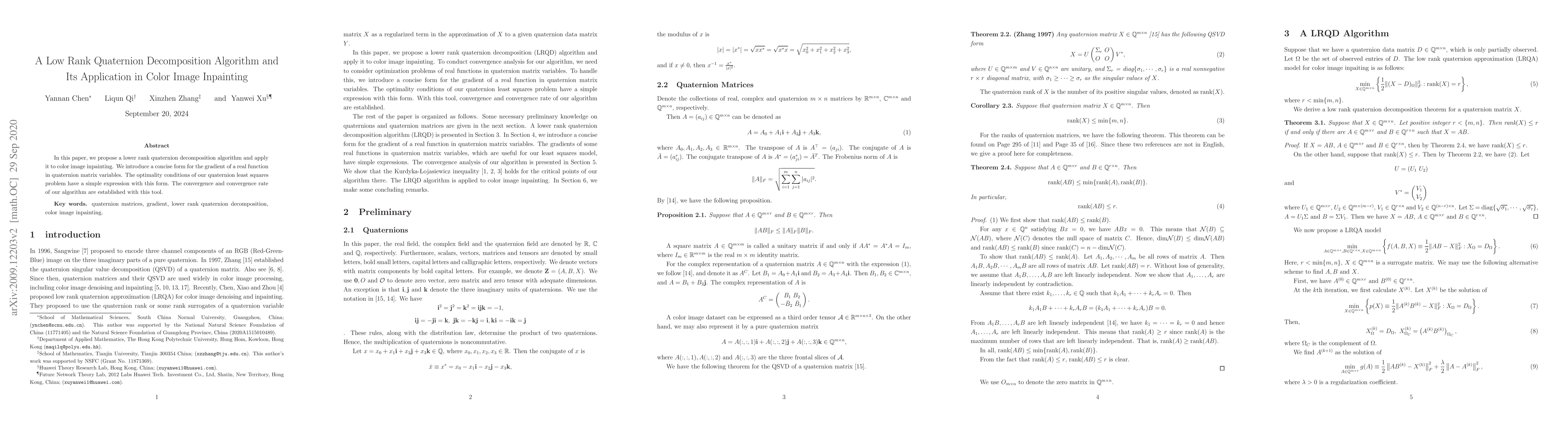 This paper proposes a low rank quaternion decomposition algorithm for color image inpainting, utilizing a concise gradient form for real functions in quaternion matrices. The authors establish the optimality conditions and demonstrate the algorithm's convergence and rate.