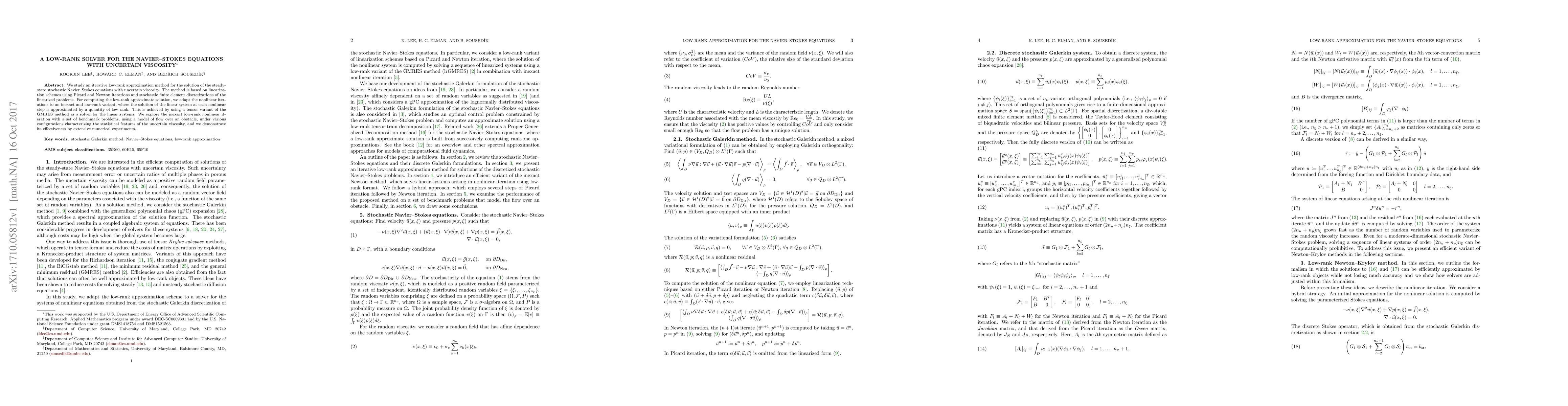 We study an iterative low-rank approximation method for the solution of the steady-state stochastic Navier--Stokes equations with uncertain viscosity. The method is based on linearization schemes using Picard and Newton iterations and stochastic finite element discretizations of the linearized problems. For computing the low-rank approximate solution, we adapt the nonlinear iterations to an inexact and low-rank variant, where the solution of the linear system at each nonlinear step is approximated by a quantity of low rank. This is achieved by using a tensor variant of the GMRES method as a solver for the linear systems. We explore the inexact low-rank nonlinear iteration with a set of benchmark problems, using a model of flow over an obstacle, under various configurations characterizing the statistical features of the uncertain viscosity, and we demonstrate its effectiveness by extensive numerical experiments.