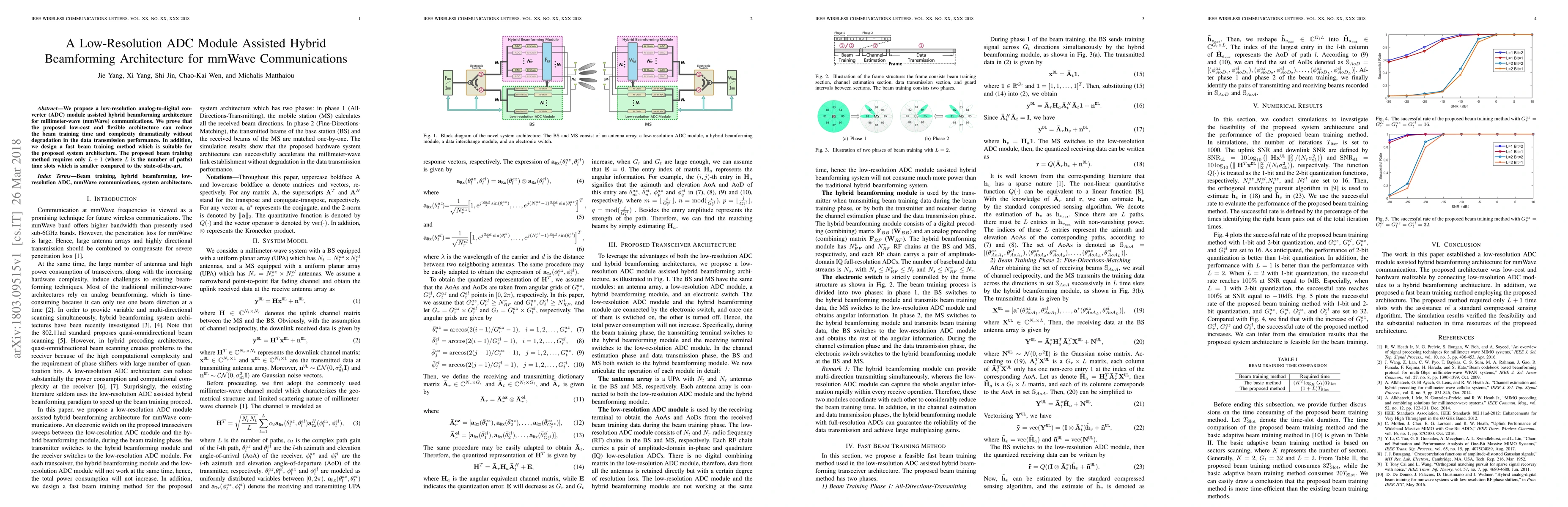 This paper proposes a low-resolution ADC-assisted hybrid beamforming architecture for mmWave communications, demonstrating significant reductions in beam training time and complexity without compromising data transmission performance. The accompanying fast beam training method requires fewer time slots compared to existing methods.