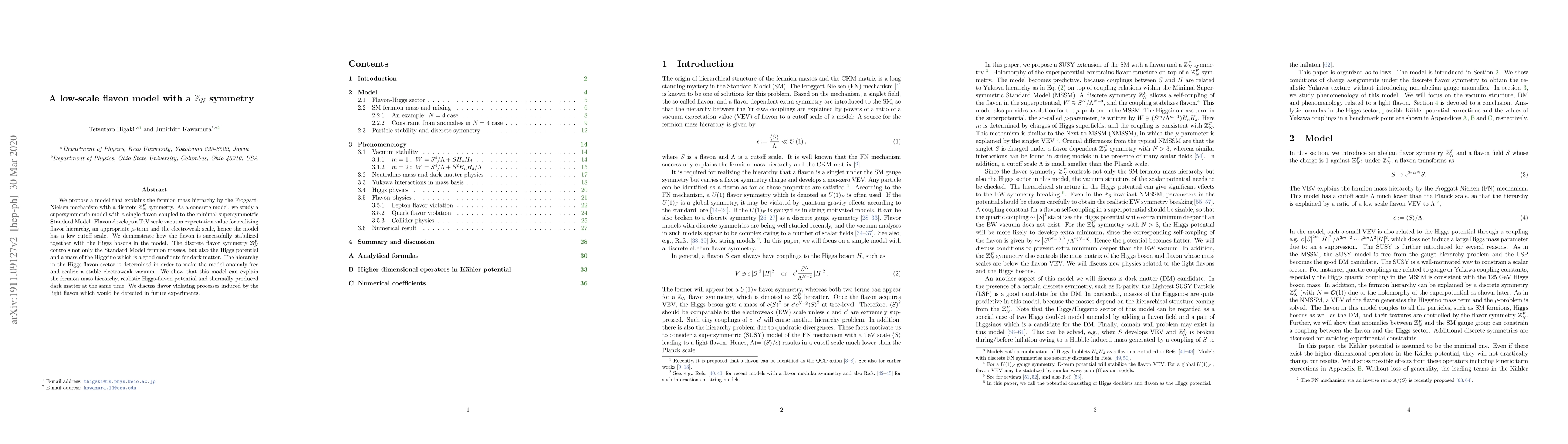 This paper proposes a supersymmetric model with a single flavon and a discrete $Z_N^F$ symmetry to explain the fermion mass hierarchy via the Froggatt-Nielsen mechanism. The model achieves a low cutoff scale and stabilizes the flavon and Higgs bosons, while ensuring anomaly-free and stable electroweak vacuum conditions.
