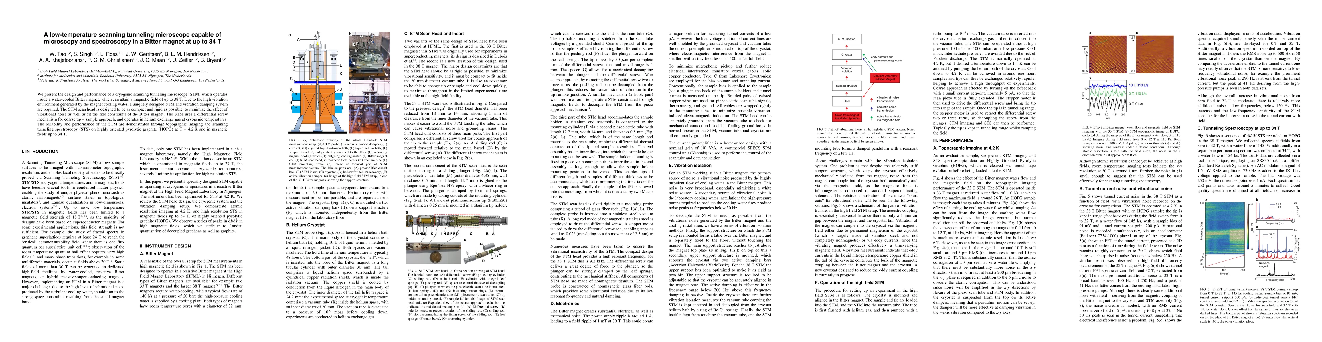 The paper details the development of a compact, vibration-dampened STM operating in a 38T Bitter magnet at cryogenic temperatures. It successfully performs topographic imaging and STS on HOPG at 4.2K and up to 34T, demonstrating its reliability and performance.