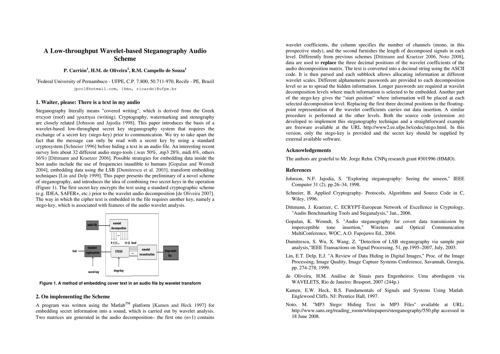 This paper presents the preliminary of a novel scheme of steganography, and introduces the idea of combining two secret keys in the operation. The first secret key encrypts the text using a standard cryptographic scheme (e.g. IDEA, SAFER+, etc.) prior to the wavelet audio decomposition. The way in which the cipher text is embedded in the file requires another key, namely a stego-key, which is associated with features of the audio wavelet analysis.