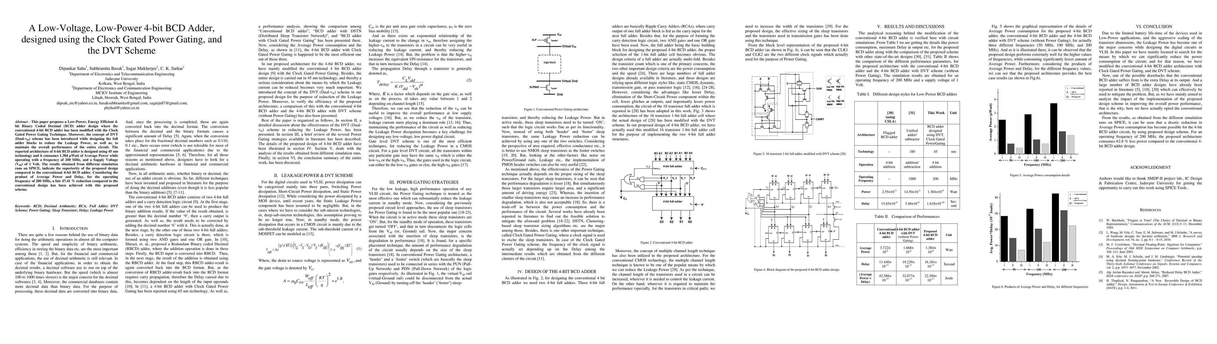 This paper proposes a low-power, energy-efficient 4-bit BCD adder using Clock Gated Power Gating and a DVT scheme for leakage reduction, achieving a 47.41% improvement over conventional designs while operating at 1 Volt and 200 MHz.
