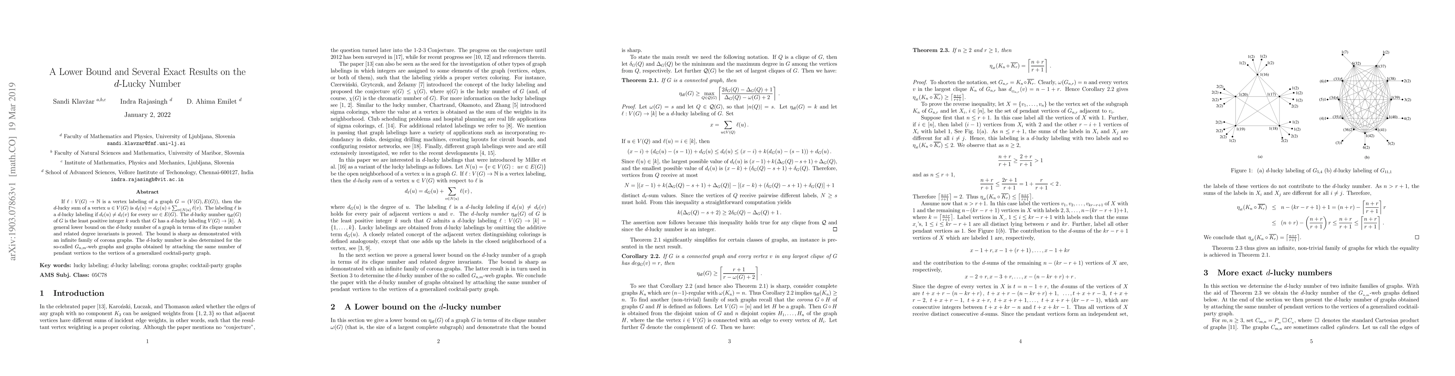 If $\ell: V(G)\rightarrow {\mathbb N}$ is a vertex labeling of a graph $G = (V(G), E(G))$, then the $d$-lucky sum of a vertex $u\in V(G)$ is $d_\ell(u) = d_G(u) + \sum_{v\in N(u)}\ell(v)$. The labeling $\ell$ is a $d$-lucky labeling if $d_\ell(u)\neq d_\ell(v)$ for every $uv\in E(G)$. The $d$-lucky number $\eta_{dl}(G)$ of $G$ is the least positive integer $k$ such that $G$ has a $d$-lucky labeling $V(G)\rightarrow [k]$. A general lower bound on the $d$-lucky number of a graph in terms of its clique number and related degree invariants is proved. The bound is sharp as demonstrated with an infinite family of corona graphs. The $d$-lucky number is also determined for the so-called $G_{n,m}$-web graphs and graphs obtained by attaching the same number of pendant vertices to the vertices of a generalized cocktail-party graph.