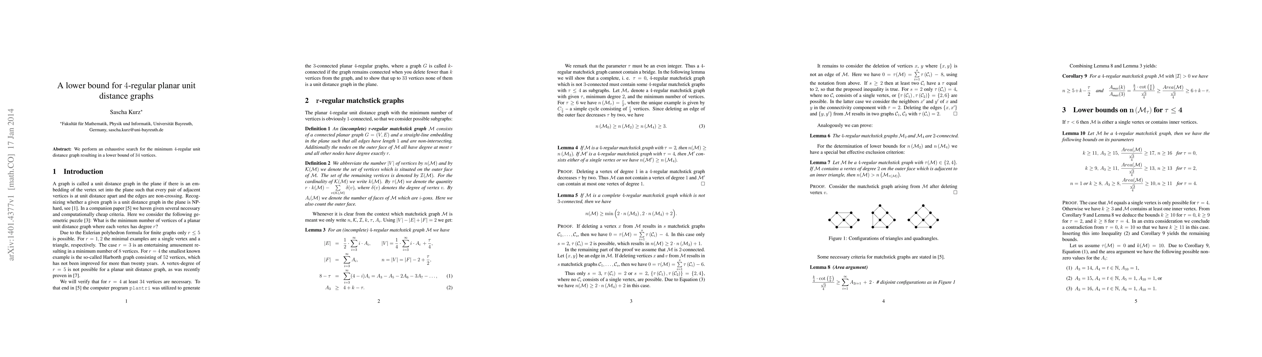 This research paper presents a lower bound of 34 vertices for the smallest 4-regular planar unit distance graph, determined through an exhaustive search method.