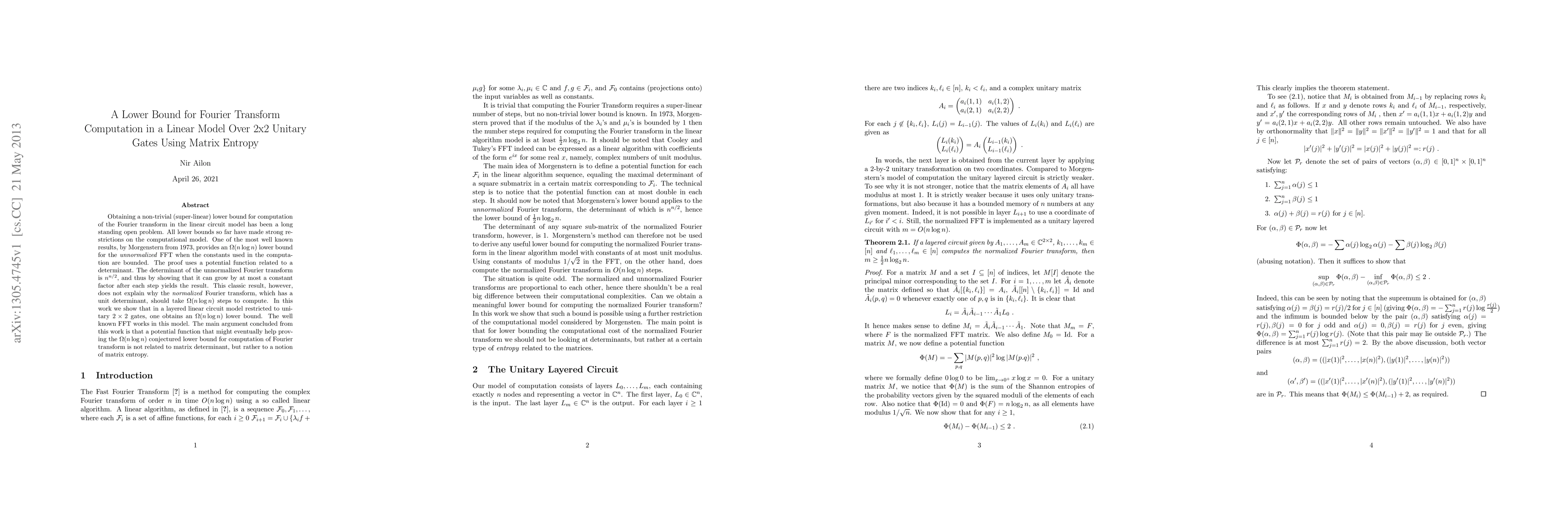 This paper establishes a lower bound of $\Omega(n \log n)$ for computing the Fourier transform in a linear circuit model using $2\times 2$ unitary gates. It argues that the potential function for proving this lower bound should be based on matrix entropy rather than matrix determinant.