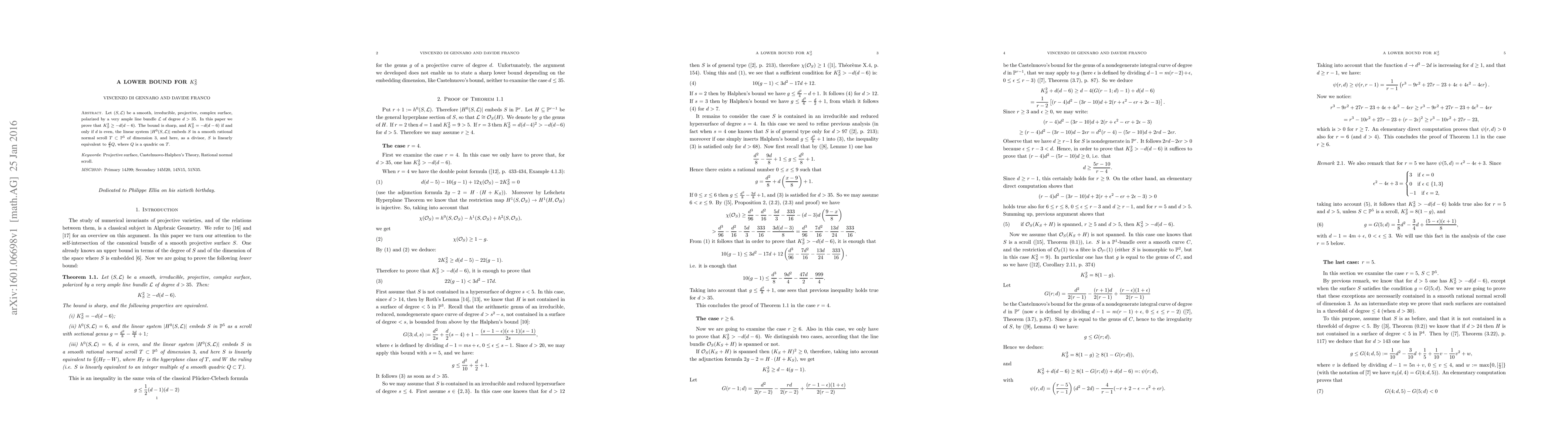 This paper establishes a lower bound for the $K^2_S$ of a smooth, projective surface with very ample line bundle, finding that $K^2_S geq -d(d-6)$.