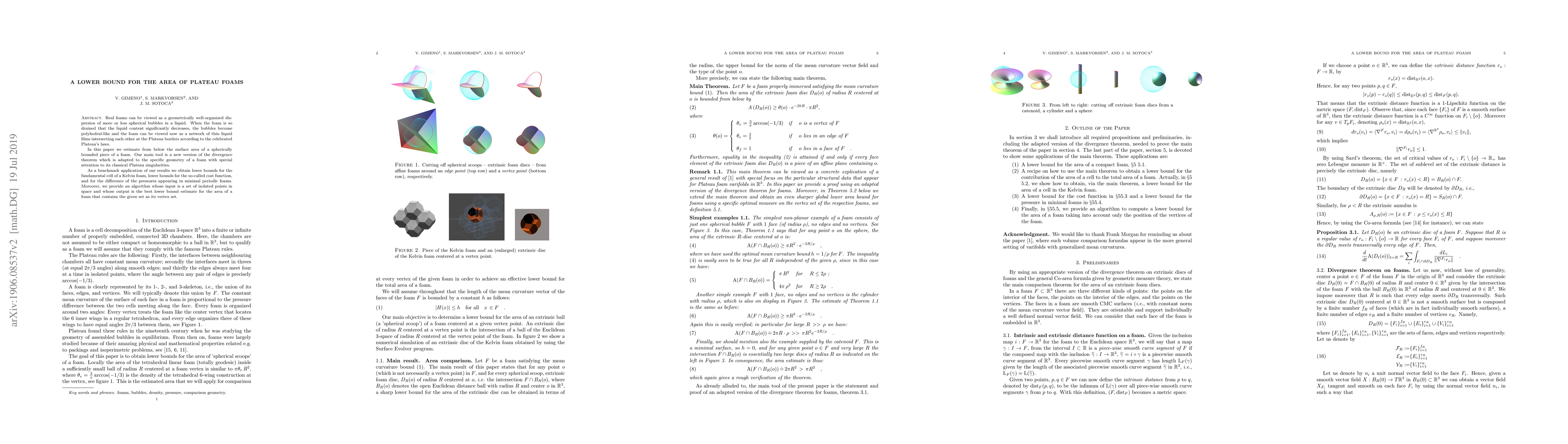 Real foams can be viewed as a geometrically well-organized dispersion of more or less spherical bubbles in a liquid. When the foam is so drained that the liquid content significantly decreases, the bubbles become polyhedral-like and the foam can be viewed now as a network of thin liquid films intersecting each other at the Plateau borders according to the celebrated Plateau's laws. In this paper we estimate from below the surface area of a spherically bounded piece of a foam. Our main tool is a new version of the divergence theorem which is adapted to the specific geometry of a foam with special attention to its classical Plateau singularities. As a benchmark application of our results we obtain lower bounds for the fundamental cell of a Kelvin foam, lower bounds for the so-called cost function, and for the difference of the pressures appearing in minimal periodic foams. Moreover, we provide an algorithm whose input is a set of isolated points in space and whose output is the best lower bound estimate for the area of a foam that contains the given set as its vertex set.