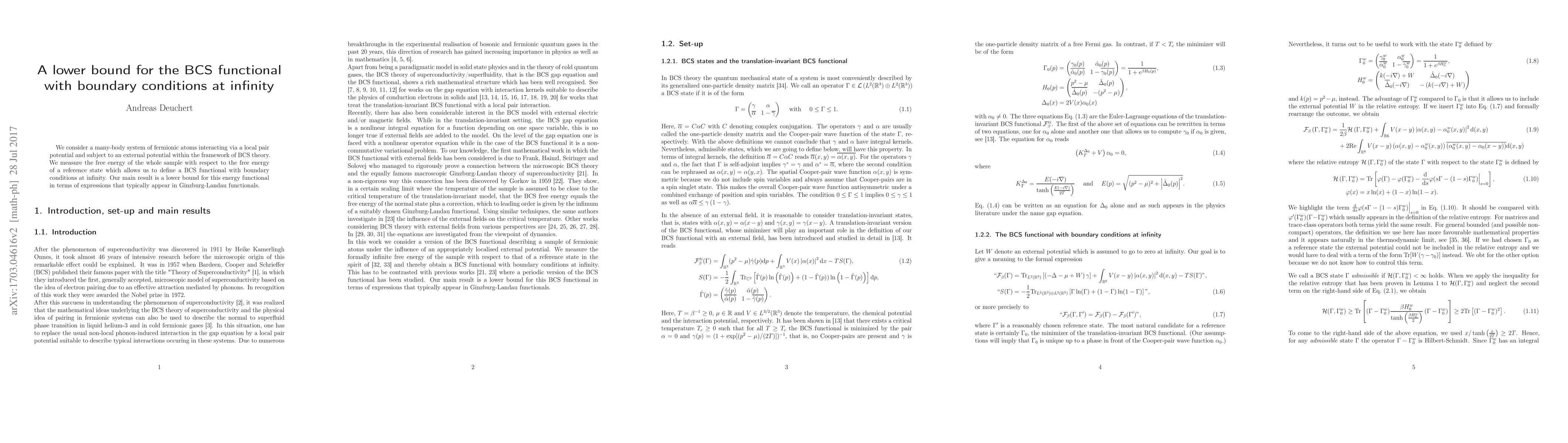 We consider a many-body system of fermionic atoms interacting via a local pair potential and subject to an external potential within the framework of BCS theory. We measure the free energy of the whole sample with respect to the free energy of a reference state which allows us to define a BCS functional with boundary conditions at infinity. Our main result is a lower bound for this energy functional in terms of expressions that typically appear in Ginzburg-Landau functionals.