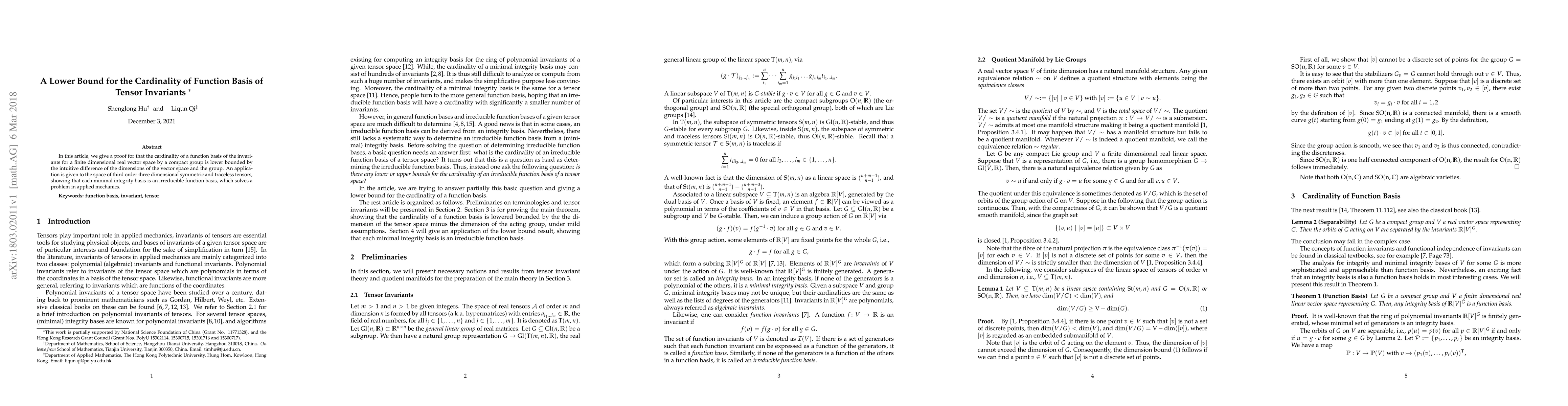 In this article, we give a proof for that the cardinality of a function basis of the invariants for a finite dimensional real vector space by a compact group is lower bounded by the intuitive difference of the dimensions of the vector space and the group. An application is given to the space of third order three dimensional symmetric and traceless tensors, showing that each minimal integrity basis is an irreducible function basis, which solves a problem in applied mechanics.