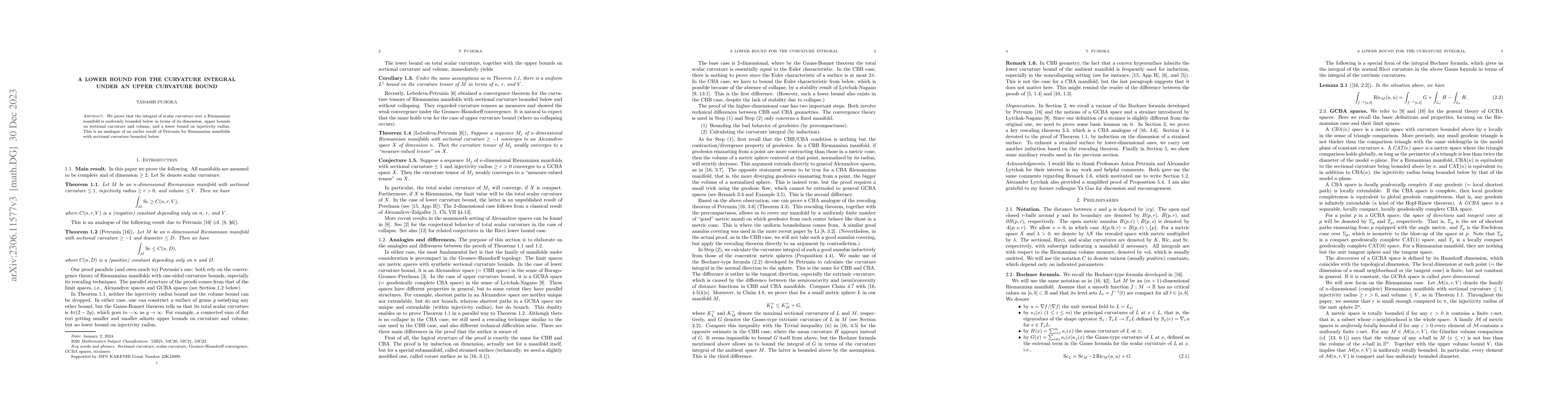 We prove that the integral of scalar curvature over a Riemannian manifold is uniformly bounded below in terms of its dimension, upper bounds on sectional curvature and volume, and a lower bound on injectivity radius. This is an analogue of an earlier result of Petrunin for Riemannian manifolds with sectional curvature bounded below.