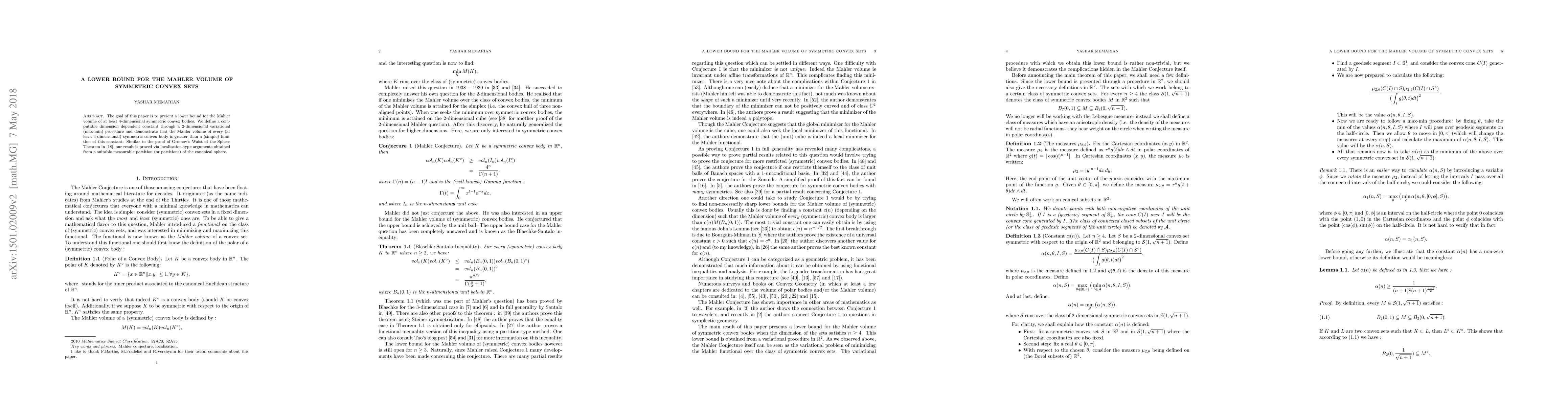 The goal of this paper is to present a lower bound for the Mahler volume of at least 4-dimensional symmetric convex bodies. We define a computable dimension dependent constant through a 2-dimensional variational (max-min) procedure and demonstrate that the Mahler volume of every (at least 4-dimensional) symmetric convex body is greater than a (simple) function of this constant. Similar to the proof of Gromov's Waist of the Sphere Theorem in [18], our result is proved via localisation-type arguments obtained from a suitable measurable partition (or partitions) of the canonical sphere.