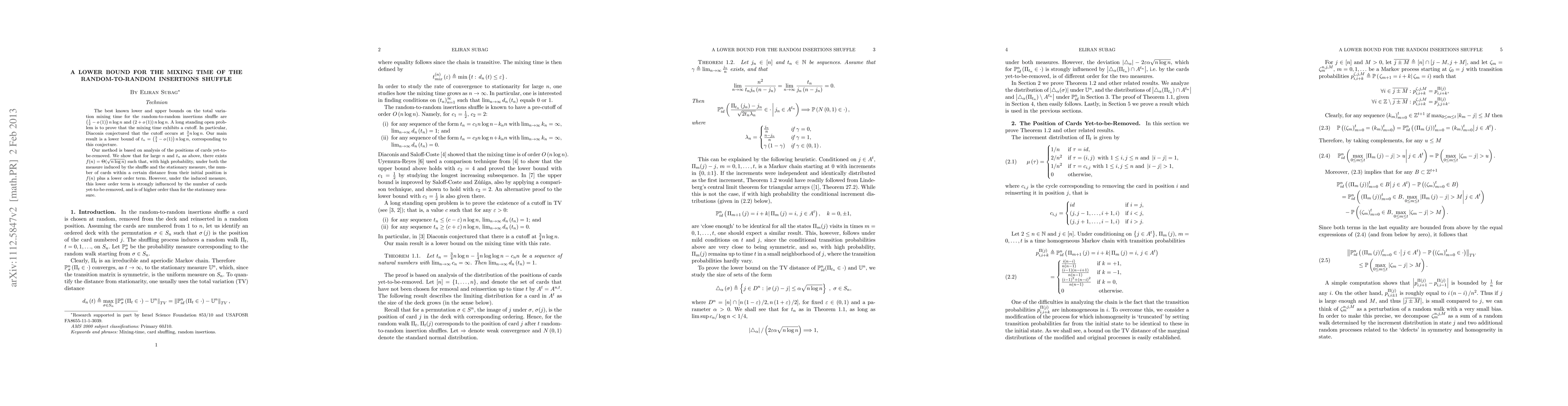 This paper establishes a lower bound of $(3/4-o(1))n\log n$ for the mixing time of the random-to-random insertions shuffle, supporting Diaconis' conjecture of a cutoff at this time. The analysis focuses on the positions of yet-to-be-removed cards, showing a significant number remain close to their initial positions, influencing the shuffle dynamics.