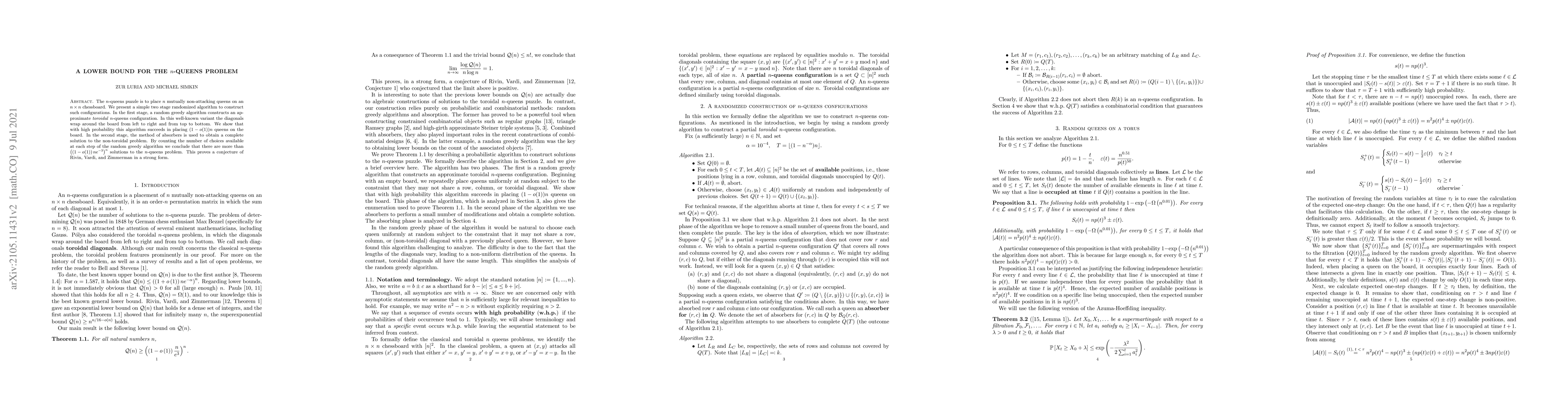 This paper presents a randomized algorithm to solve the $n$-queens problem, showing that it can place $(1-o(1))n$ queens on a toroidal chessboard with high probability. It then uses the method of absorbers to extend this to a complete solution, proving a conjecture that there are more than $\left( \left( 1 - o(1) \right) n e^{-3} \right)^n$ solutions to the $n$-queens problem.