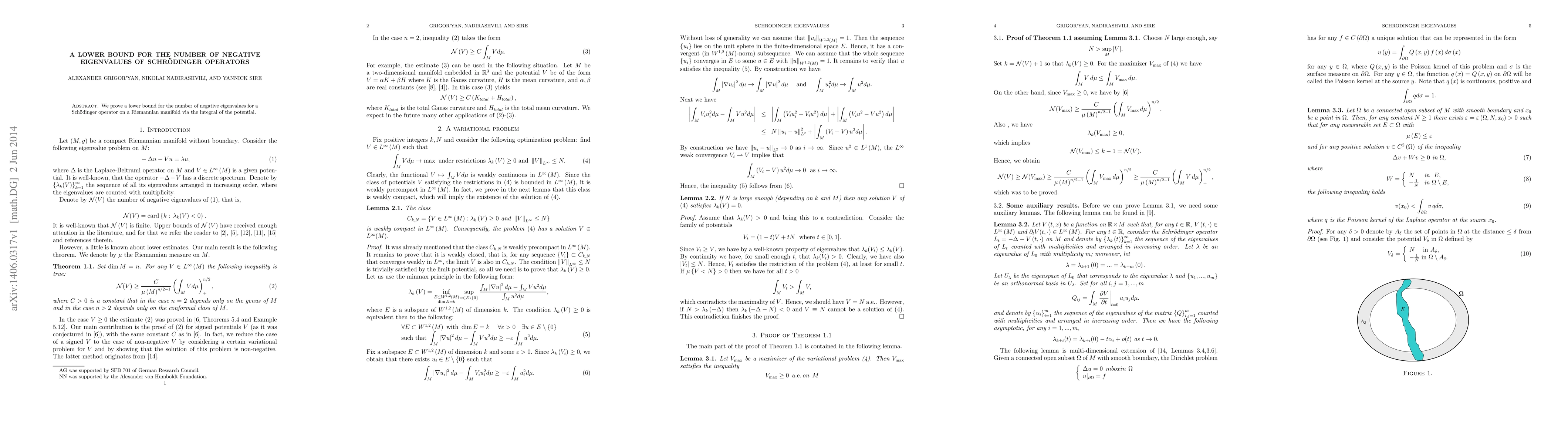 Summary: This paper establishes a lower bound for the number of negative eigenvalues of Schrödinger operators on Riemannian manifolds, utilizing the integral of the potential function to derive this bound. The result provides insight into the spectral properties of such operators.