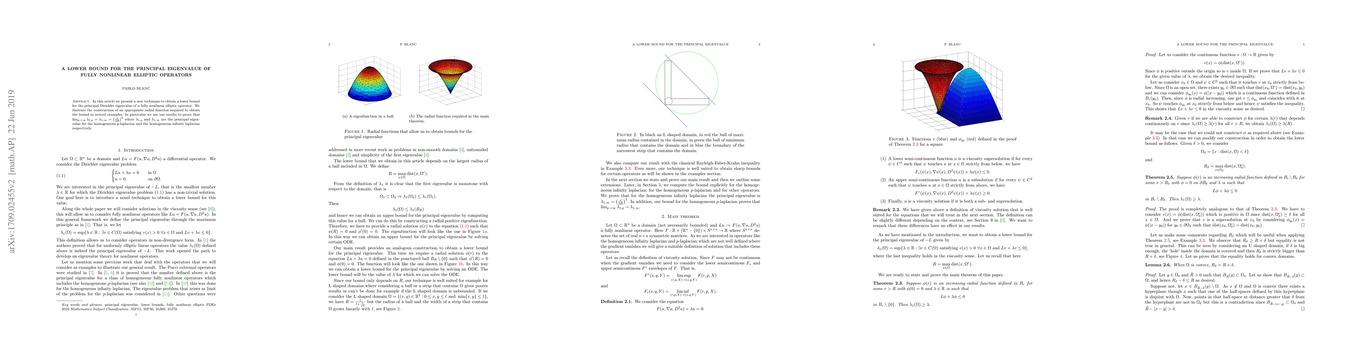 In this article we present a new technique to obtain a lower bound for the principal Dirichlet eigenvalue of a fully nonlinear elliptic operator. We ilustrate the construction of an appropriate radial function required to obtain the bound in several examples. In particular we use our results to prove that $\lim_{p\to \infty}\lambda_{1,p}=\lambda_{1,\infty}=\left(\frac{\pi}{2R}\right)^2$ where $\lambda_{1,p}$ and $\lambda_{1,\infty}$ are the principal eigenvalue for the homogeneous $p$-laplacian and the homogeneous infinity laplacian respectively.