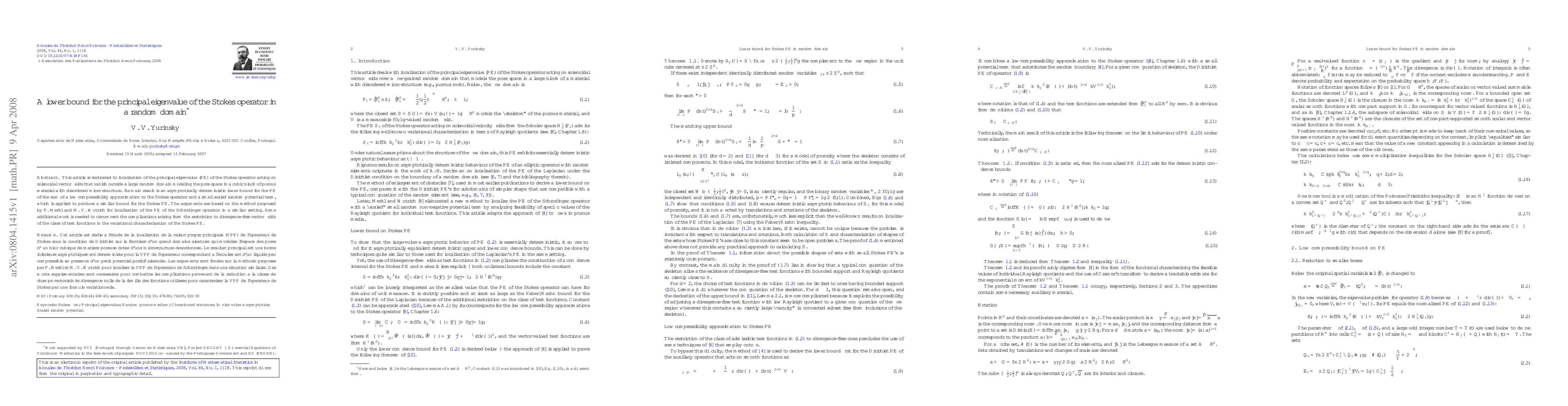 This article is dedicated to localization of the principal eigenvalue (PE) of the Stokes operator acting on solenoidal vector fields that vanish outside a large random domain modeling the pore space in a cubic block of porous material with disordered micro-structure. Its main result is an asymptotically deterministic lower bound for the PE of the sum of a low compressibility approximation to the Stokes operator and a small scaled random potential term, which is applied to produce a similar bound for the Stokes PE. The arguments are based on the method proposed by F. Merkl and M. V. W\"{u}trich for localization of the PE of the Schr\"{o}dinger operator in a similar setting. Some additional work is needed to circumvent the complications arising from the restriction to divergence-free vector fields of the class of test functions in the variational characterization of the Stokes PE.