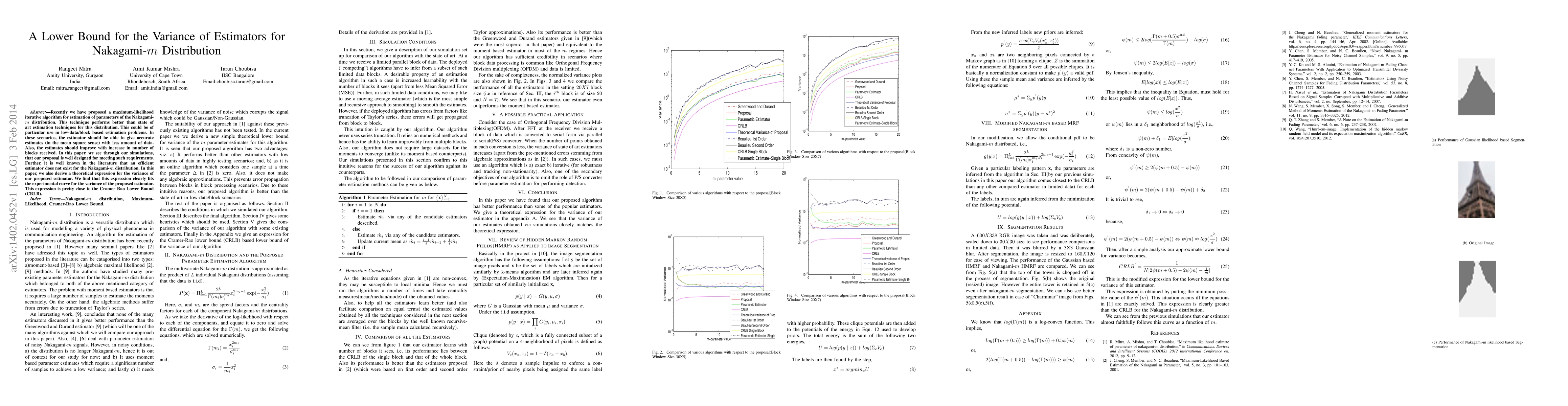 This paper proposes a new maximum likelihood iterative algorithm for estimating parameters of the Nakagami-m distribution, demonstrating superior performance in low data scenarios. The authors derive a theoretical expression for the variance of their estimator, showing it closely aligns with the Cramer-Rao lower bound, indicating its efficiency.