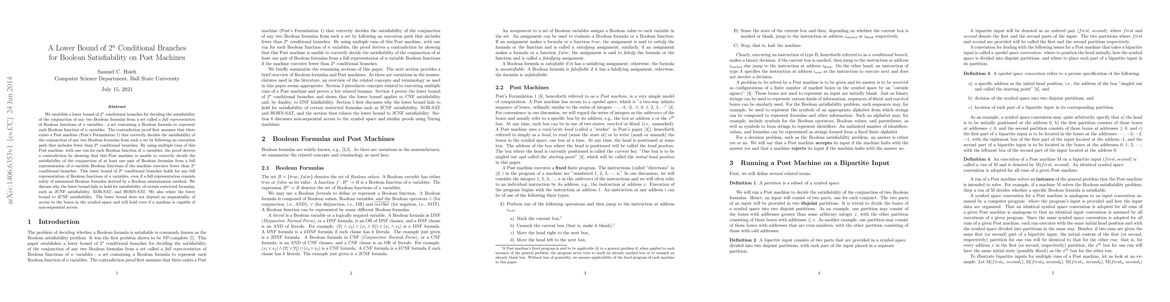 This paper establishes a lower bound of $2^n$ conditional branches for Post machines deciding the satisfiability of conjunctions of Boolean formulas from a full representation of $n$-variable Boolean functions, proving that fewer branches lead to incorrect decisions. The lower bound does not apply to restricted formula types like 2CNF, XOR-SAT, and HORN-SAT.