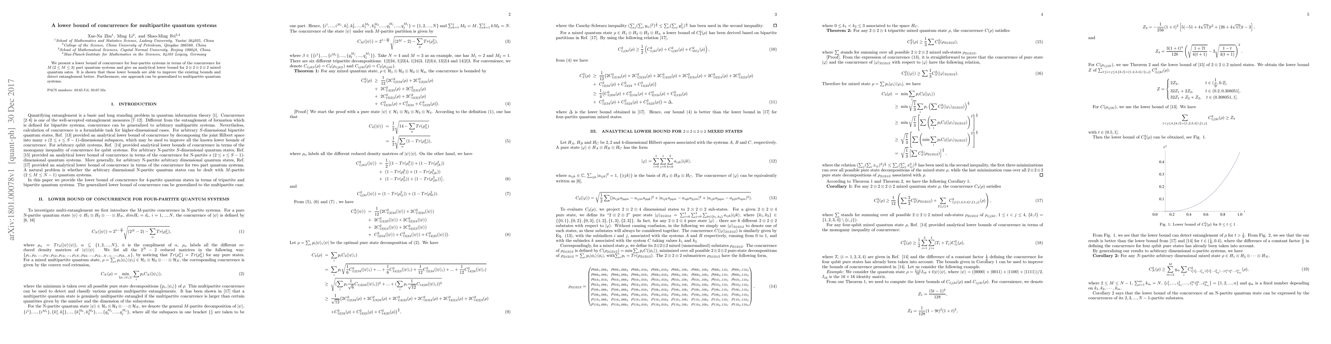 This paper establishes a new lower bound for the concurrence of four-partite quantum systems, improving upon existing bounds and enhancing entanglement detection. The method is shown to generalize to multipartite quantum systems.