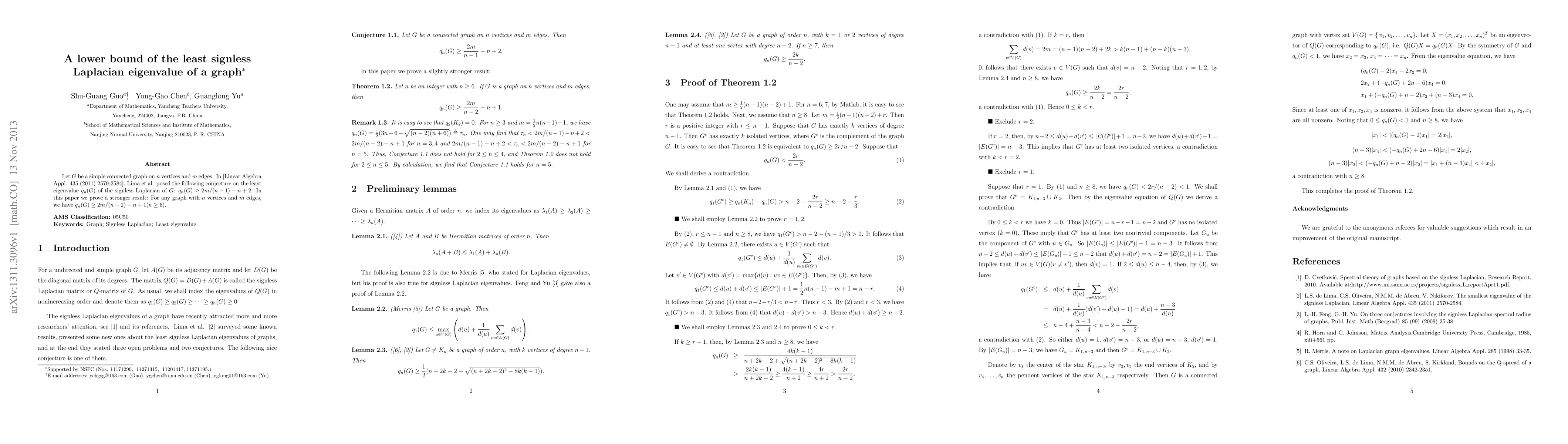 Researchers proved a stronger lower bound for the least signless Laplacian eigenvalue of a graph, showing that it is always greater than or equal to 2m/(n-2) - n + 1 for graphs with 6 or more vertices.