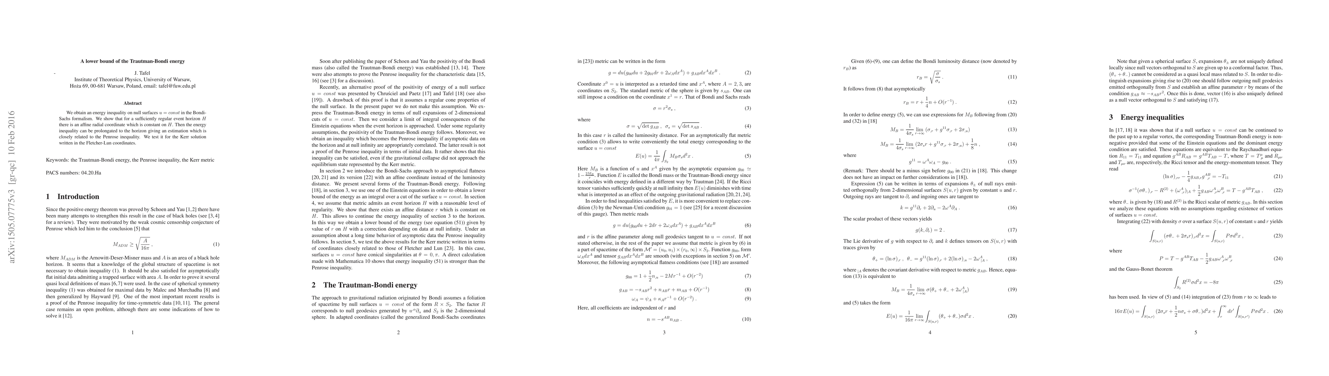 We obtain an energy inequality on null surfaces $u=const$ in the Bondi-Sachs formalism. We show that for a sufficiently regular event horizon $H$ there is an affine radial coordinate which is constant on $H$. Then the energy inequality can be prolongated to the horizon giving an estimation which is closely related to the Penrose inequality. We test it for the Kerr solution written in the Fletcher-Lun coordinates.