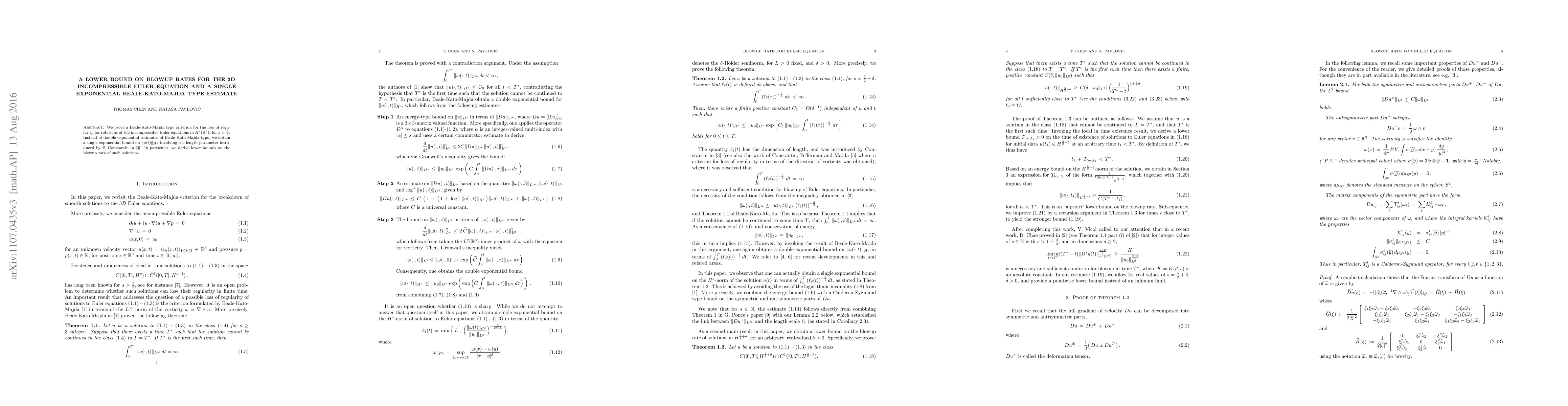 This paper establishes a Beale-Kato-Majda criterion for the loss of regularity in 3D incompressible Euler equations, proving a single exponential estimate instead of the traditional double exponential. The authors derive lower bounds on the blowup rate using a length parameter introduced by P. Constantin.