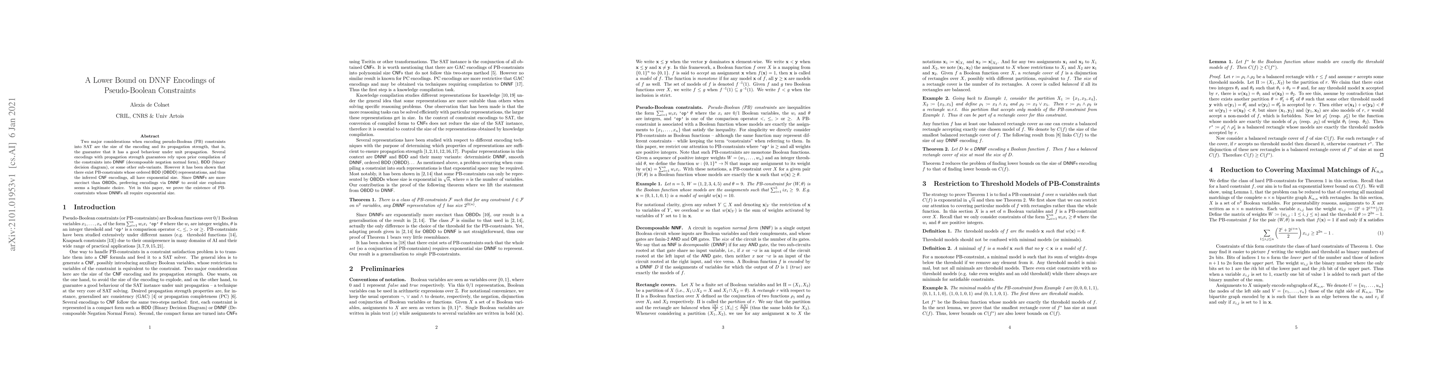 This paper establishes a lower bound on the size of DNNF encodings for pseudo-Boolean constraints, demonstrating that certain constraints cannot be efficiently represented in DNNF without exponential size growth. It underscores the limitations of using DNNF to avoid size explosion in SAT encodings.
