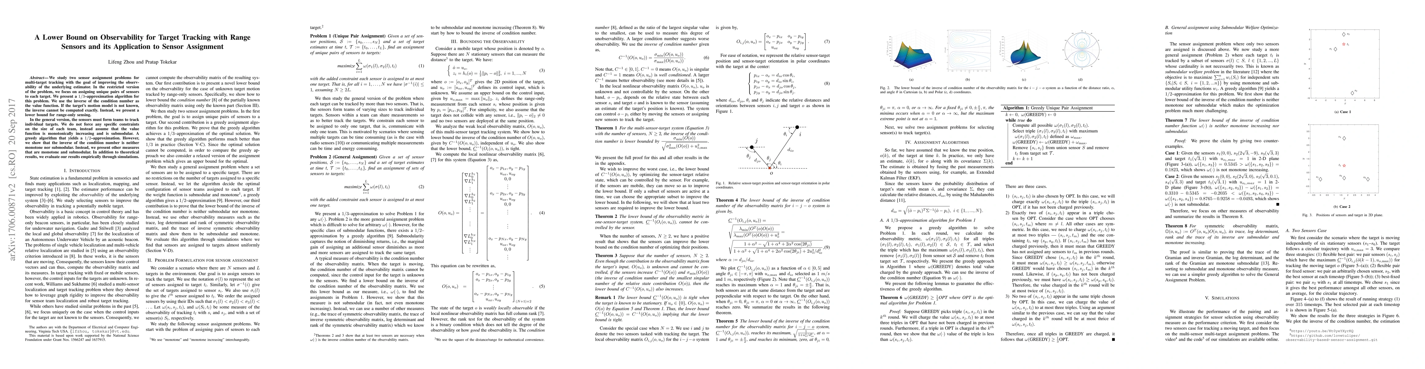 We study two sensor assignment problems for multi-target tracking with the goal of improving the observability of the underlying estimator. In the restricted version of the problem, we focus on assigning unique pairs of sensors to each target. We present a 1/3-approximation algorithm for this problem. We use the inverse of the condition number as the value function. If the target's motion model is not known, the inverse cannot be computed exactly. Instead, we present a lower bound for range-only sensing. In the general version, the sensors must form teams to track individual targets. We do not force any specific constraints on the size of each team, instead assume that the value function is monotonically increasing and is submodular. A greedy algorithm that yields a 1/2-approximation. However, we show that the inverse of the condition number is neither monotone nor submodular. Instead, we present other measures that are monotone and submodular. In addition to theoretical results, we evaluate our results empirically through simulations.