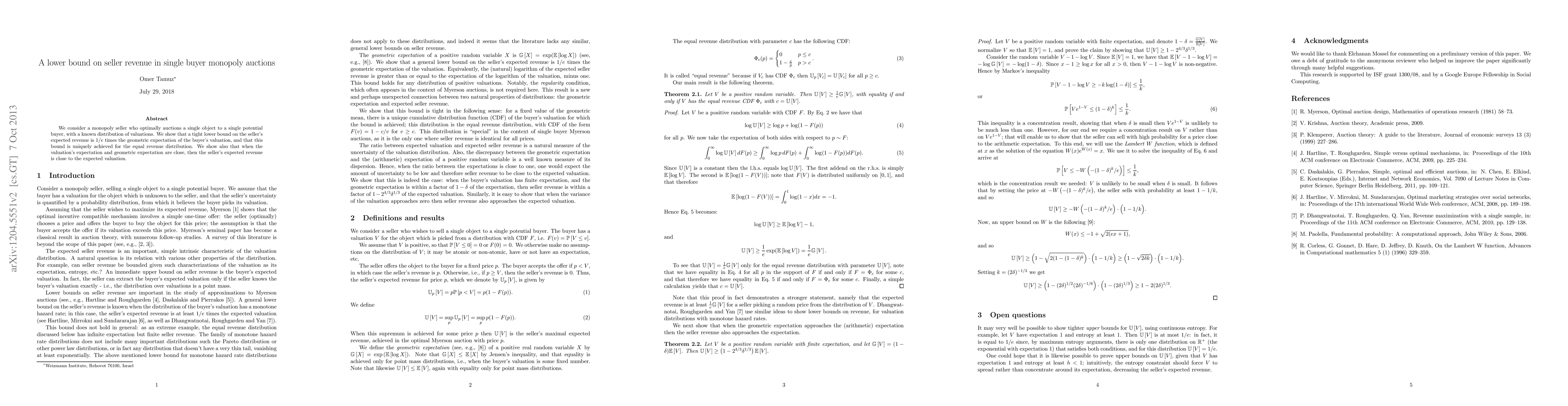 We consider a monopoly seller who optimally auctions a single object to a single potential buyer, with a known distribution of valuations. We show that a tight lower bound on the seller's expected revenue is $1/e$ times the geometric expectation of the buyer's valuation, and that this bound is uniquely achieved for the equal revenue distribution. We show also that when the valuation's expectation and geometric expectation are close, then the seller's expected revenue is close to the expected valuation.